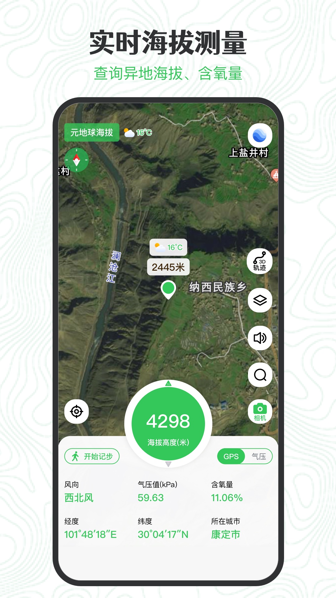 元地球海拔,海拔测量仪是一款可异地海拔查询的gps工具箱软件,离线无网也可使用,帮助您在自驾游、爬山过程中实时关注海拔,时刻注意高反风险!<br><br> 主要功能:<br>1.GPS/气压测海拔(离线可用):通过手机GPS或气压传感器(需手机硬件支持)获取实时海拔,测量位置、经纬度,更有含氧量,气压,湿度,气压值,风向等天气数据,气压测海拔支持室内测量海拔。<br>2.异地海拔、含氧量查询:单击地图即可知晓异地海拔含氧量,无需实地测量即可知道海拔,自驾海拔地图旅游攻略规划好帮手!<br>3.户外工具:指南针:无信号状态也可以指明方向经纬度,速度,磁场强度信息;水平仪:测量垂直,水平度数。<br>4.水印海拔相机:可以给图片添加当前海拔、含氧量、天气、经纬度、湿度、气压值、地点、时间信息,也可以直接给照片添加信息。<br>5.单位切换:实时海拔高度单位,经纬度坐标的单位,气压单位。<br>6.地震预警:各地地震情况实时了解。