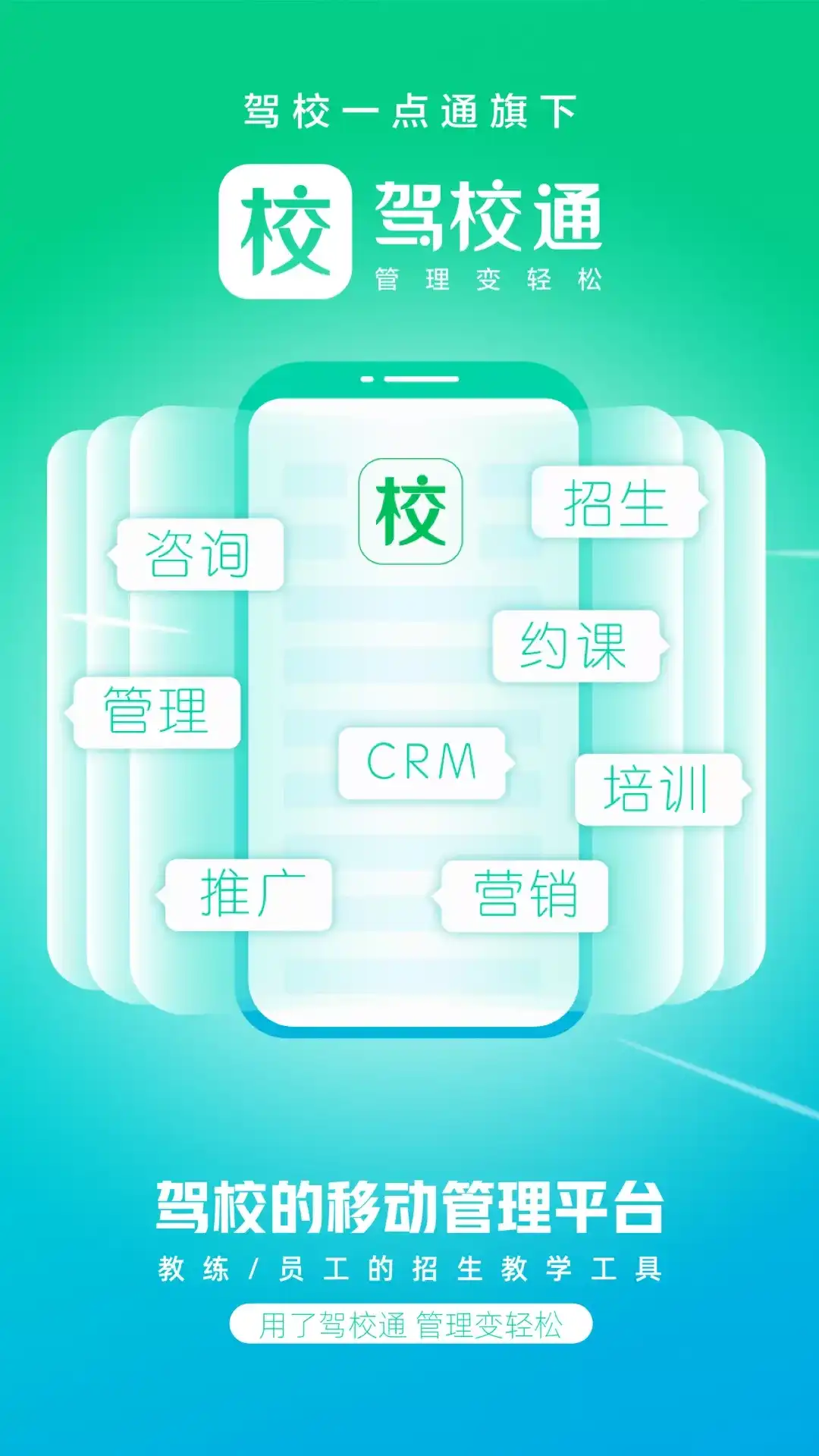 驾校通是一款为驾校和教练量身定制的集招生推广、教学培训、统计报表、运营管理为一体的产品,是驾校和教练的移动管理平台和招生工具,致力于帮助驾校及教练解决招生难题,提升教学水平、管理效率和服务质量。 产品功能 【驾校管理】驾校通移动管理平台,学员档案、招生统计、考试记录、财务报表、员工绩效等实时掌握。 【约课管理】预约培训智能化管理,学员预约、教练排课多种模式,教练实时获取课程安排,教学培训更高效。 【招生通】品牌招生服务,专属特权独家推送意向学员,智能精准匹配,真正解决招生难题。 【报名咨询】整合潜在意向学员、销售跟进全流程管理,轻松提升招生转化和业绩。 【营销推广】招生名片、招生海报、招生段子、限时特惠、优惠券等素材一键获取,随时分享转发。 【教练服务】注册教练官方认证,平台免费展示,教练可收到驾校一点通的学车学员信息,帮助教练招生。