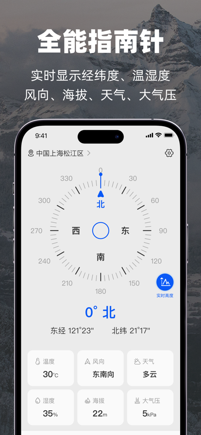 神行天下,方向为先,一款优秀的海拔数据产品能带您上山下海。 功能亮点: 海拔:精确的海拔数据,实时更新的海拔高度表 GPS加持:GPS加持下的海拔数据更准确,数据更新更及时 风速:实施展示当前风速 精准指南针:无论是户外探险还是城市漫步,我们的高精度指南针功能都能确保您永远找到正确的方向。界面简洁,操作方便,是您值得信赖的导航伴侣。 经纬度:高精尖卫星定位经纬度,实时掌握准确的位置信息。 24小时天气预报:实时更新您当前位置的天气状况,包括温度、湿度、风速等信息,让您随时做好出行准备。 未来6日天气预测:规划前置,不仅知晓今天,更能预见未来6天的天气变化,为您的日程安排提供有力参考。 全球时差查询:一键查看莫斯科、纽约、东京这些国际大都会的当前时间,无论跨国会议还是远方亲友连线,都能轻松掌好时机。 当日详细天气:除了基本天气信息,还提供日出日落时间、空气质量指数、穿衣建议等贴心提示,让每一天的生活更加精致。 内置地图:集成高精度地图服务,支持多种地图模式切换,无论是寻找路线还是探索未知区域,都能得心应手。 适用场景: 户外活动:登山、徒步、野营时的好伴侣,帮助您在大自然中保持方向感。 旅行出行:出国旅游或商务差旅,即时查询目的地天气,合理安排行程。 日常生活:上下班、接送孩子、购物逛街,根据天气变化选择合适穿着,享受更舒适的生活。 学习工作:了解不同城市的时差,优化国际沟通与协作时间。 使用方式: 下载并打开应用,即可直接使用指南针功能。 开启定位权限,以获取准确的天气预报和地理位置信息。 在设置中,您可以自定义添加或删除需要关注的城市时间,以及选择地图类型和天气提醒偏好。 用户好评如潮: “这不仅仅是一个指南针,它是我出行必备的万能工具!”—— 探险爱好者@山野行者 “有了它,我再也没错过过任何一场重要国际会议的黄金时间。”—— 商务人士@飞行者 “每日穿搭建议超实用,再也不用担心天气变化了!”—— 时尚博主@潮流先锋 结语: 在这个快节奏的时代,让“指南针”成为您口袋里的智能助手,无论是探索世界的每一个角落,还是享受日常生活的每一刻,它都将是您可靠的伙伴。立即下载,开启您的智慧生活之旅! 协议内容 用户协议:https://docs.qq.com/doc/p/ce625b9fa90ac0e0b97d9a0c3a32db4f949a5794 隐私协议:https://docs.qq.com/doc/p/e6a17f377867431cd7f821b5c3f61f34a6672546 我们的应用中包含了一个或多个订阅服务,包括包含免费试用的商品,商品订阅相关费用会由苹果公司通过用户授权的iTunes账户自动扣款,每个续订前24小时内可前往授权iTunes账户内关闭自动续订