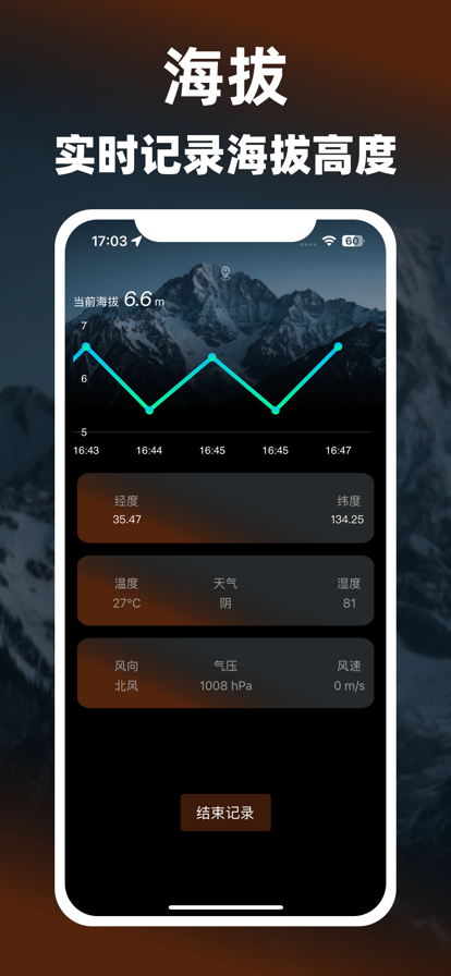 实时海拔高度显示 帮助您更好的探索野外,规划行程。 【海拔高度】 实时显示当前海拔高度、实时速度、大气压、经纬度 。为你提供野外探险的信息。 【精准定位信息】 结合GPS定位与磁场感应,户外导航无漂移 夜间模式+震动反馈,复杂环境也能精准指引方向 经纬度、海拔、气压、湿度、能见度等指标都能轻松查看 【实时天气】 精准显示当地天气,温度、状态随时掌握。 【丰富适用场景】 无论是工作拍照、考勤打卡、工程管理、外勤、旅拍、爱宠、宝宝成长都可清晰准确记录、保存重要瞬间~ 【超多水印选项】 时间、地点、天气、海拔、风速、湿度、经纬度、方位角、倒计时、农历、星座、年龄、节日等可自由定义。 【AR智能尺子】 毫米级精度,墙面/家具测量误差<0.5% 支持历史数据查看。轻松复制到剪切板使用。做工作留痕好帮手! 【温馨提示】 您同意并使用真实轨迹相关功能期间,本应用需在后台持续使用GPS定位服务,这可能会消耗更多的电量,并影响电池续航时间。 隐私协议:https://www.privacypolicies.com/live/a3e017f7-893e-469b-bb39-88828537c449 会员付费协议:https://www.apple.com/legal/internet-services/itunes/dev/stdeula/