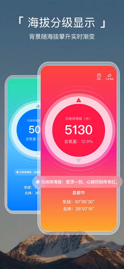 绿狮®海拔相机App - 海拔气压含氧量实时查询 海拔相机App是一款集成了高度测量与海拔监测功能的多用途工具。通过这一App,用户可以轻松地使用实时海拔表功能,查看当前海拔高度,并进行海拔测试。无论是西藏的高原,还是青海、云南、四川、新疆等地区,这款App都能精准地显示海拔、测量高度、测试海拔,并提供海拔气压和海拔温度数据。海拔相机App不仅提供了免费的海拔测量仪、实时海拔高度测量、海拔图,还具有测高仪、海拔测量仪免费、实时软件等强大功能,适用于各种户外活动。用户可以利用这款App的海拔高度计和高度表功能,实时监控海拔速度、测海拔高度和测量高度,并通过GPS海拔高功能准确获取当前海拔信息。无论你是在进行高原探险还是日常测量,海拔相机App都是你的理想选择。 每一次旅行,都是对世界的深度探索。 海拔相机App,记录世界的每一个高度。无论是徒步穿越山川,还是驾车驰骋高原,海拔相机App都是您记录旅程、分享旅游照片的优选应用。 实时海拔查询,精准定位一目了然 只需打开App,即刻获取当前位置的实时海拔高度、气压和空气含氧量。无论是登山探险还是高原旅行,精准数据让您的每一步都心中有数。 经典自驾徒步路牌,打卡水印增添趣味 在旅途中,用海拔相机App记录下每一个特别的时刻。选择自驾徒步登山路牌水印,让您的照片不仅拥有地理标签,更添一份旅行的仪式感。 分享打卡照片,连接每一位旅行者 通过海拔相机App,轻松分享您的旅行故事和打卡照片。无论是雪山之巅的壮丽,还是高原湖泊的宁静,让更多人通过您的镜头感受世界的美好。 制作旅游路书,规划您的专属旅程 使用海拔相机App制作个性化旅游路书,记录您的旅行计划和路线。它不仅是您旅行的指南,也是您美好回忆的载体。 结交旅游搭子,让旅程不再孤单 在海拔相机App,遇见志同道合的旅行者。一起分享旅行心得,结伴探索未知,让旅程充满更多可能和乐趣。 海拔相机App是一款强大的工具,为用户提供准确的海拔测量和实时高度显示功能。它结合了高度表和海拔测量仪的优势,能够实时显示当前海拔和高度。通过GPS技术,海拔相机可以精准测量海拔高度,支持实时海拔表和实时高度表,确保您在不同环境下(如西藏、青海、云南等高原地区)的高度数据准确无误。应用内置的海拔测量仪免费功能和海拔高度测量仪功能,允许用户方便地测量和测试海拔高度,并且可以使用实时海拔高度测量和海拔速度等高级功能。对于户外活动爱好者,海拔软件还提供海拔气温、海拔天气和实时海拔测量仪等实用工具,帮助用户应对各种户外挑战。你可以利用海拔图查看详细的海拔数据,海拔水印功能可以在照片上标记海拔信息,确保每次户外探险都有准确的海拔数据记录。总之,海拔相机App是测量海拔和高度的理想选择,特别适合需要精准海拔测量的场合。 中国爬山登山打卡路牌: 珠穆朗玛峰(海拔8848.86米)、贡嘎山(海拔7556米)、乔戈里峰(K2海拔8611米)、黄山(海拔1864米)、泰山(海拔1545米)、华山(海拔2154.9米)、衡山(海拔1300.2米)、恒山(海拔2017米)、峨眉山(海拔3099米)、九华山(海拔1344米)、普陀山(海拔283米)、庐山(海拔1474米)、武夷山(海拔2158米) 青海爬山登山打卡路牌: 昆仑山(玉珠峰海拔6178米)、阿尼玛卿山(玛卿岗日海拔6282米)、祁连山(团结峰海拔5547米)、巴颜喀拉山(布喀达坂峰海拔5369米)、年宝玉则(海拔5369米) 云南爬山登山打卡路牌: 梅里雪山(卡瓦格博峰海拔6740米)、玉龙雪山(扇子陡海拔5596米)、苍山(马龙峰海拔4122米)、哈巴雪山(海拔5396米)、鸡足山(海拔3248米)、轿子雪山(海拔4223米)、西山(海拔2419米)、老君山(海拔4359米) 西藏爬山登山打卡路牌: 珠穆朗玛峰(海拔8848.86米)、卓奥友峰(海拔8188米)、洛子峰(海拔8516米)、马卡鲁峰(海拔8485米)、希夏邦马峰(海拔8027米)、纳木那尼峰(海拔7694米)、冈仁波齐峰(海拔6638米)、念青唐古拉山(海拔7162米)、玉珠峰(海拔6178米) 四川爬山登山打卡路牌: 贡嘎山(海拔7556米)、四姑娘山(幺妹峰海拔6250米)、峨眉山(海拔3099米)、青城山(海拔1206米)、稻城亚丁(仙乃日海拔6032米)、九寨沟(海拔4750米)、瓦屋山(海拔3522米)、木里大寺山(海拔6553米) 中国知名徒步线路 新疆徒步地点:东疆大海道、伊利、喀拉峻、喀纳斯秋色、托乎拉苏、孟克德古道、喀拉峻百公里、夏特北线、乌孙古道、新疆K2大本营徒步、狼塔C+V、博格达大环线 四川徒步地点:贡嘎西南坡、党岭、格聂南坡、七藏沟、雅拉穿越、长穿毕、莲花湖-伍须海穿越 、格聂C线、贡嘎全线、洛克线、亚丁北线、亚丁大转 、四姑娘山大峰、四姑娘山二峰、乌库楚、那玛峰 云南徒步地点:阿佤山、高黎贡、石头城、虎跳峡、哈巴西坡、西双版纳雨林穿越、香格里拉尼汝穿越、阿布吉措、怒江徒步、梅里雨崩转山、梅里北坡 、哈巴雪山 东北徒步地点:长白山、小兴安岭、大兴安岭、林海雪原 华南徒步地点:漓江徒步、贵州韭菜坪、龙脊梯田徒步、湘西秘境、无限黔徒 华中徒步地点:恩施徒步、三峡红叶徒步、野长城徒步、太行山全景、神农架徒步、五台山 内蒙徒步地点:乌兰布统秋色、呼伦贝尔、巴丹吉林沙漠、腾格里沙漠 西藏徒步地点:库拉岗日、藏东南冰川、南迦巴瓦大本营、阿里转山、他念他翁、珠峰东坡、希夏邦马大环线、墨脱徒步 江西徒步地点:武功
