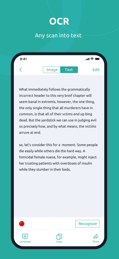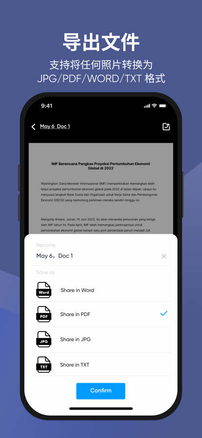 本产品是一款提取图片中的文字信息的OCR软件,支持图片转文字,图片转Excel,批量识别图片,PDF文件扫描,任何印刷文本等都能扫描识别,提取文字仅仅只需2步就可以完成,支持把提取到的内容一键转换为epub / pdf / docx / xlsx等格式,是一款小巧的数字化文档管理工具,它能够极大的提高您的办公效率。 应用特色: 【多种语言识别】 - 支持多种语言识别:中文(竖排),英语,日语(竖排),韩语,法语,德语等26种语言 【图片文字提取】 - 智能 OCR 识别多种文件类型:pdf文件、图片、手写文本、书籍等提取想要的文字 - 支持批量识别图片 【Excel表格识别】 - 支持将图片中的Excel转换成Excel文件,智能解析表格文字,快速识别生成Excel表格 - 支持将多个Excel文件转换成Word文件 - 支持将多个Excel文件合并成1个Excel文件 【多格式导出】 - 可以导出为epub / pdf / docx / xlsx 等多种格式的文档 【数字化文档管理】 - 智能裁剪,灵活选择需要的图片区域,轻松管理工作、学习、生活中的各类资料 使用建议: 为确保你能获得正确的扫描识别结果,请在拍照时: * 光线充足,避免抖动 * 尽量使图片占满拍摄屏幕 * 尽量使用清晰的图片,不要出现阴影遮挡文字信息 隐私政策: http://apptermsuse.lofter.com/post/2017d158_12d72ee4f 使用条款:http://apptermsuse.lofter.com/post/2017d158_12d72de9d