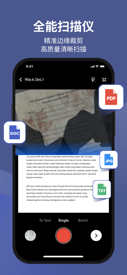 扫描全能王是一款集文件扫描、图片文字提取识别、PDF 内容编辑、PDF 分割合并、PDF 转 Word、电子签名等功能于一体的智能扫描软件。自动扫描,生成高清扫描件,支持JPEG、PDF 等多格式保存,还能将扫描件一键转换为 Word/ Excel/ PPT 等多种格式文档,通过手机、平板电脑、电脑等多设备同步查看。 -----功能亮点----- 【手机扫描仪】 手机拍纸质文档,智能去除杂乱背景,生成高清JPEG、PDF文件。默认自动扫描,对准纸质文档自动拍照,解放双手。 支持多种图像优化模式,可手动调节图像参数,将纸质文件快速转为清晰的扫描件。 【图片转文字利器】 智能 OCR 识别文字,即使搜索对象是图片,也能输入关键词轻松定位,高亮显示。 支持识别中、英、日、韩、葡、法等 41 种语言,还能一键复制、编辑图片上的文字,支持导出为 Word/Text/TXT 格式。 【个人文档管家】 支持一键导入 PDF、图片、表格等多类型电子文档;标签归类,多文件夹保存,一站式管理保存工作、学习、生活中各类资料。 手机、平板、电脑等多设备端,随时同步查看管理文档。 【PDF 编辑修改】 自由组合 PDF 文档,对多个文件进行页面删除、顺序调整、插入支持、页面合并等操作。 支持一键涂抹、添加批注,轻松编辑文档;高级账户还能设置智能水印铺满,一键生成电子签名等功能,确保文档安全。 【PDF格式转换】 PDF、Word、Excel、PPT 和图像文档之间格式互相转换,一键分享或下载到本地; 格式转换后可保持文本、图像等文档的原始布局,实现版面还原。 ----他们都在用扫描全能王做什么---- ● 职场人士:随时扫描手边合同、公司证件、开会 PPT 等,一键保存或分享PDF,随时查找翻阅,非常给力的办公软件 ● 学生:课堂扫描笔记、白板、PPT,复习找资料快速又方便;线上提交纸质材料、个人证件扫描件,高清又专业 ● 老师:扫描课堂白板内容、学生考卷错题整理,发给家长同步教学进度,老师用心家长安心 ● 医生:疑难病症资料随时扫描记录,同行交流会议 PPT 留存,整理留档,也方便给其他医院科室共同交流 ● 设计师:扫描保存设计手稿,一键提取线稿,随时捕捉灵感初现时的大胆想象 …… -----升级高级帐户,享更多强大功能----- ● 纸质文档一键转换 Word/Excel,轻松整理各类报表报告; ● 拍图识字,提取图片或扫描件中的文字,一键复制导出,快速整理资料; ● PDF 加密、添加电子签名、一键铺满水印等,分享协作高效安全; ● 支持身份证、护照、企业三证、户口本等近百种证件扫描,1:1 生成高清扫描件,可用于证照资料提交、电子开户等; ● 10G 超大云空间,文件夹分类标签管理,查找使用更方便。 一经确认购买订阅产品,iTunes会直接扣除相关订阅所需费用。 扫描全能王高级帐户可通过iTunes帐户信用卡直接付费订购。若当前订购周期(一个月/一年)结束前24小时内仍未取消续订,将会自动续订下个周期的高级帐户。 在当前订购周期内,无法取消当前周期的使用。您可以通过iTunes帐户的设置来管理或取消购买。 您的试用会立即结束,如果您付费购买了产品内的订阅。 关于服务条款: https://www.camscanner.com/app/service?language=zh-cn 关于隐私政策: https://www.camscanner.com/app/privacy?language=zh-cn ----使用建议---- 为确保你能获得清晰的扫描图,请在拍照时: ● 光线充足,尽量避免抖动 ● 尽量使图片占满拍摄屏幕 若你喜欢扫描全能王,或者有其他任何意见,请花一点时间给我们写评论,或发邮件至isupport@camscanner.com,这将帮助我们不断改进产品,给你更好的使用体验! ----关注我们 ---- 在新浪微博上关注我们 @扫描全能王 在微信上关注我们,搜索公众号:扫描全能王 在Twitter上关注我们 @CamScanner 在Facebook 上关注我们:CamScanner 在Google+上关注我们:CamScanner
