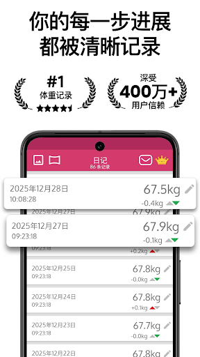<b><h2>身体测量 & 减重追踪器</h2></b>使用我们的减重追踪器应用程序轻松跟踪您的减重旅程!凭借友好的用户界面和<b>可定制的功能</b>,您可以轻松设定并实现体重<b>目标</b>。只需输入您的每日体重数值,我们的应用程序就会生成<b>图表</b>来直观地跟踪您的进展。设定<b>提醒事项</b>来记录您的体重,跟踪您的卡路里和锻炼情况,并从我们的个性化仪表板获取<b>见解</b>和<b>动力</b>。有了身体日记:身体测量追踪器,达到理想体重从未如此简单!<br><br><b><h2>深受用户喜爱的附加功能 ❤️</h2></b><br>➜ 可保存您身体的私人照片(正面、背面、左侧和右侧)。<br>➜前后照片自动生成器。<br>➜ 📊<b>Excel文件</b>实用程序,用于导入或导出您的数据(提示:轻松与您的私人教练或营养师分享)。<br>➜ 🗓️<b>体重日历</b>生成器,以类似日历的方式轻松查看或分享您的进展,这在社交媒体上现今非常流行(提示:#体重追踪器 #体重追踪日历)。<br>➜ 🤩 <b>每月概述</b> ,对您的成就的激励性总结。<br><br><b>对于数据迷 🤓:</b><br><br>➜ 估算您每日总能量消耗(<b>TDEE</b>)的<b>卡路里计算器</b>,<br>➜ 基础代谢率(<b>BMR</b>)计算器,<br>➜ <b>常量营养素</b>计算器,<br>➜ 身体质量指数(<b>BMI</b>)计算器,<br>➜ 用于跟踪您的<b>身体测量数据</b>的身体测量追踪器,<br>➜ 以及大量有关的教育内容。<br><br><b>高级功能</b><br><br>➜ ☁️<b>自动备份</b>,<br>➜ 🔏<b>屏幕锁定</b>,<br>➜ 附加<b>应用颜色</b>,<br>➜ 附加<b>配置文件</b>,<br>➜ <b>深色模式</b><br>➜ 建议的体重和趋势分析,<br>➜ 以及更多。<br><br><b><h2>健康连接集成(测试)</h2></b><br>我们非常高兴推出一项测试功能,得益于我们与Android的Health Connect的合作,此项功能提供了一种全面的综合健康方法。无缝统一您的健康数据,收集全面的见解,提升您的健康之旅。<br><br>在这个测试阶段,应用程序会自动填充步数、活动、距离、卡路里、水分、睡眠和月经流量的数据,让您享受丰富的洞见。您的反馈对于完善这种集成体验至关重要。<br><br><b>🔅 温馨提示</b><br><br>减重是一个长期的旅程和生活方式的改变。专家建议,您的目标应该是每周减少不超过1公斤(2.2磅),以便在您准备保持体重时,身体不会反弹。<br><br><b>💬 我们洗耳恭听</b><br><br><b>1,104,482名会员</b>与我们一起改变了他们的健康之旅。每一条反馈都是宝贵的财富,帮助我们完善和提升我们的产品😍。<br><br>通过📩<b>contact@selantoapps.com</b>与我们联系,或用5星★★★★★评价照亮我们的一天。