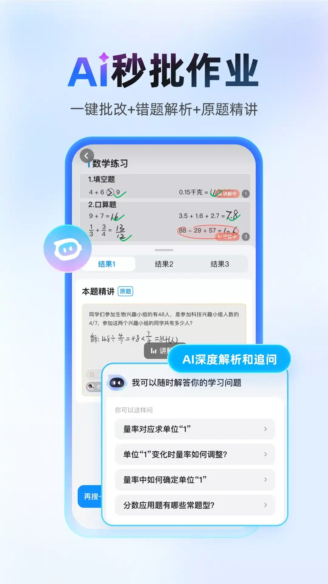 作业帮,AI时代的学习神器!拥有超19亿大数据题库的智能学习平台,依托领先AI技术,打造更准确、更高效的学习体验。 【作业帮AI核心功能】 AI智能答疑:支持搜单题、搜整页、搜作文,19亿题库秒出解析!AI深度解析解题思路,智能追问薄弱点,推荐关联知识点,让学习举一反三,作业难题不再愁。 AI秒批作业:一键秒批全科作业,涵盖作业批改、口算批改和作文批改,错题解析+原题精讲,AI准确定位学习盲区,轻松帮助家长完成作业检查。 AI校内同步:智能同步教材章节,准确定位考试重难点,个性化推荐同步练习题和单元测试,形成"学-练-测"完整闭环,助力快速掌握知识点。 AI写作:同步语文学习进度,成文质量贴合范文标准,全面支持写全文、写英文、写开头结尾。AI作文批改,按照年级/体裁/单元作文内置批改标准。包括六维度评级、全文点评、句子纠错、佳句赏析、思路点拨、全文润色。 视频讲解:93%超高讲解覆盖率,AI智能匹配原题/相似题视频解析,教材精讲精准推送,解题步骤清晰易懂,学习效率倍增。