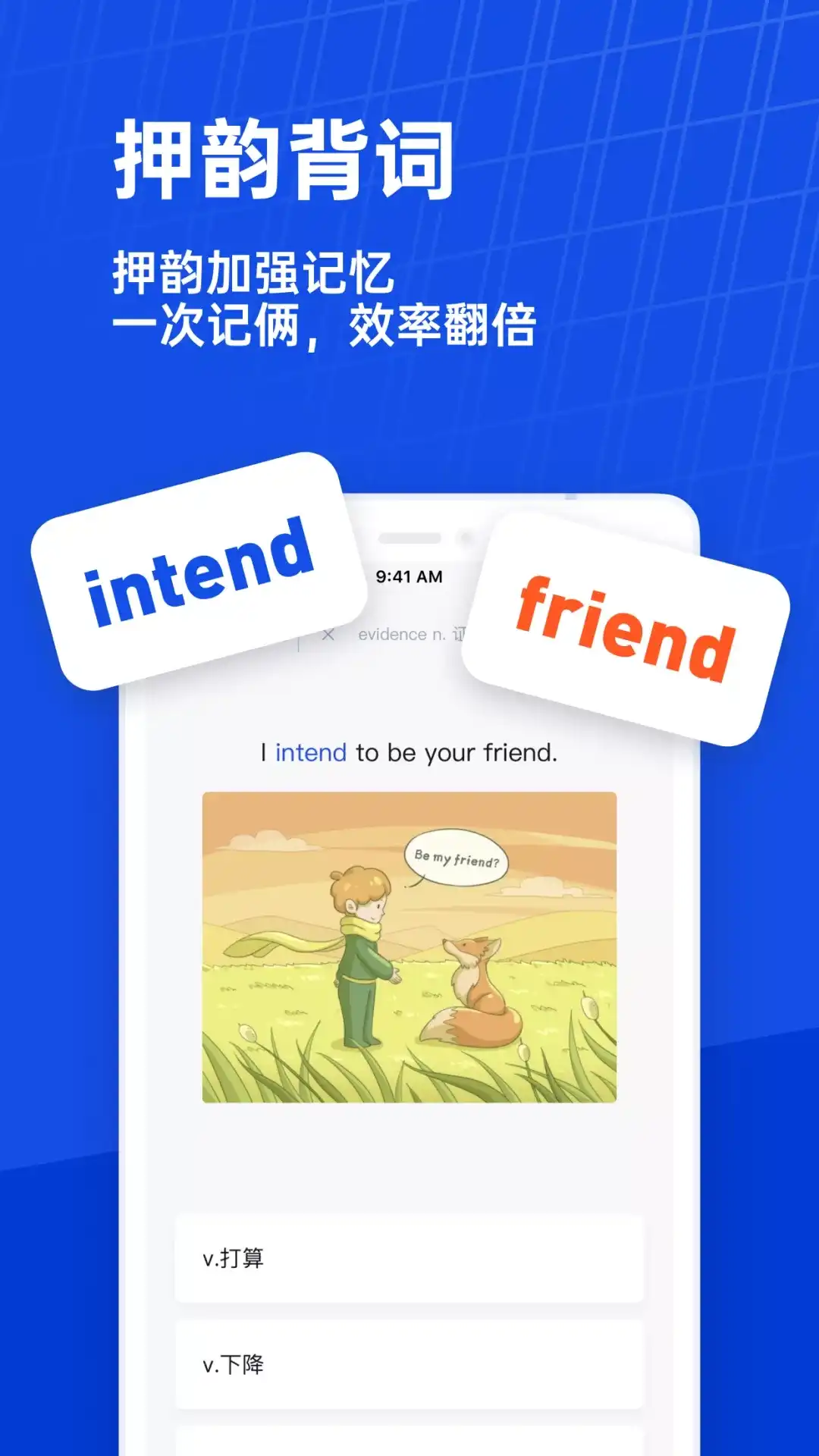 ■ 安卓市场英语学习必备推荐应用 ■ 累计用户超2.3亿、全网好评超100万+ 英语先过单词关,2亿人用百词斩!图片背单词、押韵背单词、8类专项单词训练,轻松解决你的背单词难题,让你趣味学习、高效记忆! 【详解单词 - 记得准】 • 考试级读音原声录制,背词更加身临其境 • 立体化解析单词内容,单词变形全部搞定 • 全方位素材辅助记忆,内容掌握效果显著 【海量词书 - 记得全】 • 内含200+权威词库,满足各类人群学习需求 • 覆盖小学/中学/四六级/考研/雅思/托福等词书 • 权威考纲+精选内容,为你学习之路保驾护航 【复习利器 - 记得牢】 • 英文选义/中文选词,互译训练效果佳 • 全拼组合/填空拼写,单词默写效率高 • 读词填空/单词速听,听读写译一把抓 【定制学习 - 记得清】 • 定制个性学习计划,适合自己最重要 • 记录点滴学习行为,效果提升看得见 • 多重推送提醒学习,形成习惯不懈怠 【趣味活动 - 有动力】 • 加入班级、同桌,完成学习奖励多 • 单词游戏在线PK,一起学习有动力 • 组队打卡分享,让进步随时随地发生