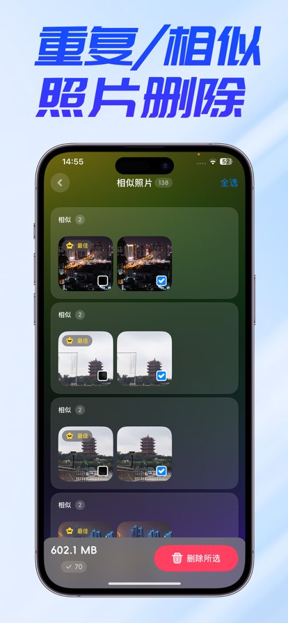 清理大师 —— 手机更干净,空间更充足 界面简洁流畅,帮助你轻松整理相册。通过智能识别、AI 找图和一键口令整理,让清理更精准、更高效。 ===========核心功能=========== • 智能照片清理:自动识别相似、连拍、模糊、截图等无用图片。 • AI 搜索照片:输入关键词即可快速定位目标照片。 • AI 一键整理:一句话完成清理,如“删除上周的照片”。 • 图片/视频压缩:高质量压缩,节省大量存储。 • 智能相册:按时间地点自动分类,轻松查看每段回忆 ==========更多实用功能========== 1.极速清理 - 左右滑动快速浏览相册,上滑即可删除不需要的照片。 - 操作流畅、反馈即时,支持批量处理与快速筛选。 2. 截图清理 - 自动识别聊天截图、工作截图、系统截图等。 - 一键筛选无用内容,删除前可预览,避免误删。 3. 模糊/失焦照片清理 - AI 识别模糊、抖动、过曝等质量较低图片,集中展示便于统一删除。 - 支持模糊程度对比,提高判断准确性。 4. 相似图片清理 - 智能识别重复构图或多张相似角度照片。 - 自动推荐最清晰、最好看的照片。 - 一键删除剩余图片,释放大量空间。 5. 连拍照片整理 - 自动识别连拍系列照片,且支持手动对比选择。 - 分析每张照片的表情、清晰度等信息,推荐保留项。 6. 视频清理 - 自动识别大尺寸或过长视频。 - 支持按大小、时长排序,快速定位占空间文件。 - 预览后可直接删除或压缩。 7. 智能相册分类 - 按日期、地点自动聚合内容,且详情页可自由滑动浏览。 - 支持快速跳转至某段时间或某个事件。 8. AI 搜索照片 - 输入“风景”“自拍”等即可精准检索 - 快速定位大量照片中的特定内容,搜索更高效。 9. AI 口令一键整理 - 输入简单口令即可执行整理,如: “删除模糊照片”“清理上个月照片”。 适用人群 • 手机存储经常不足的用户 • 照片量巨大、想快速整理的用户 • 有大量截图、重复照片的用户 • 喜欢拍照、记录生活、需要空间管理的人 • 想让手机更干净、运行更流畅的用户 使用场景 • 手机提示“存储空间不足” • 旅行拍照后产生大量相似/连拍照片 • 工作截图堆积导致相册杂乱 • 想快速定位某类照片(如票据、文件、自拍) • 临时需要大量空间下载应用或拍视频 订阅说明 - 订阅将通过 iTunes 账户扣费。 - 到期前 24 小时内,如未关闭自动续订,将自动续费下一周期。 - 您可在到期前至少 24 小时,前往 设置 → Apple ID → 订阅 管理和关闭自动续订。 - 我们提供免费试用,试用结束后将自动转为订阅,如需取消请提前关闭。 使用清理大师即表示您同意我们的隐私政策和用户协议: 隐私政策:http://zhineng.taozantek.com/privacy.html 用户协议:http://zhineng.taozantek.com/agreement.html