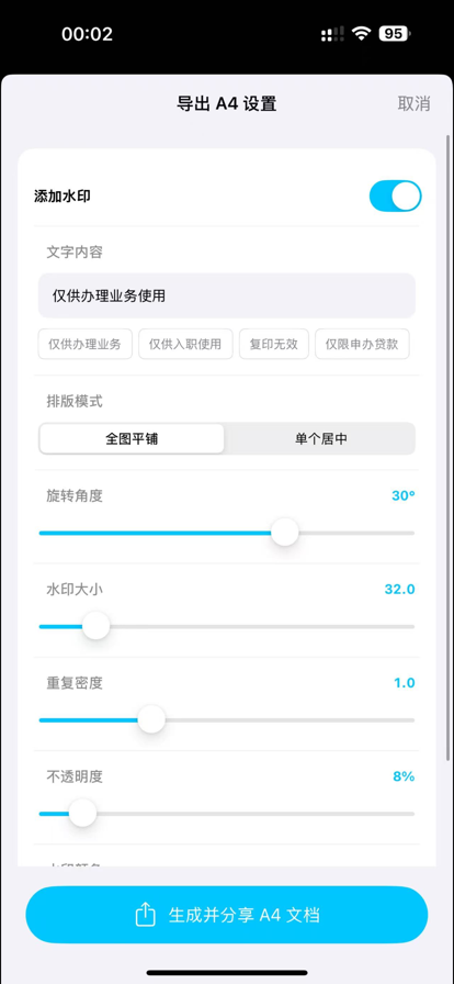 简易水印是一款界面简洁操作简单的水印制作软件。 可以证件以及文件等照片一键添加水印,制作完成后可以直接手机打印分享,让你的信息更加安全。 支持批量制作水印图片,只需制作一次即可,智能自动制作其他图片。 支持蒙版水印、图片水印和文字水印模式。 主要功能: 1、蒙版水印,可以快速让图片铺满水印,支持自定义文字颜色、透明度、方向、密度、粗细和大小。 2、图片水印,可以快速让图片添加图片水印,支持自定义图片透明度、位置、大小和旋转角度。 3、文字水印,可以快速添加自定义文字水印,支持自定义文字颜色、透明度、粗细、大小和旋转角度。