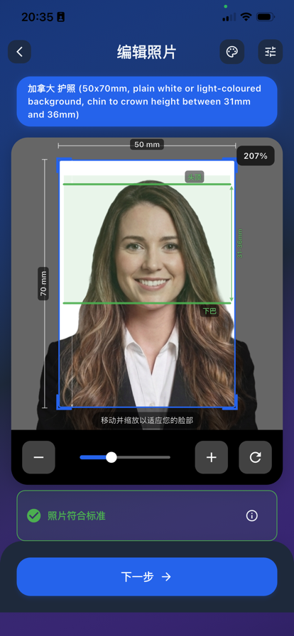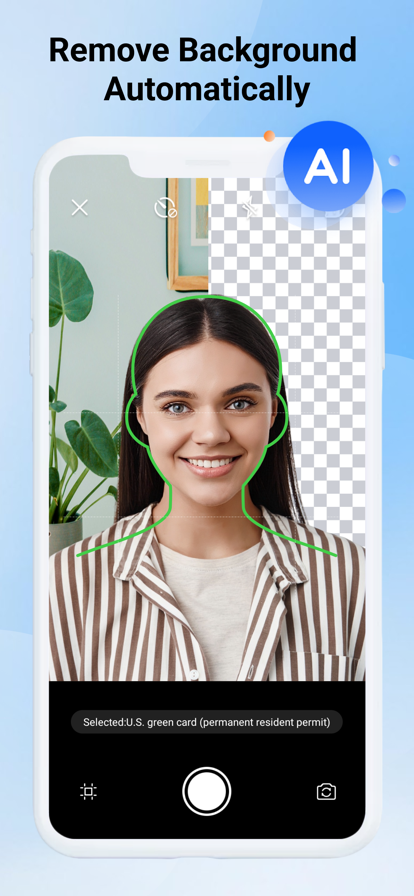 在家就能拍出专业的证件照!!该应用软件还会自动编辑您的照片,使其更符合官方要求。 只需先自拍一张照片,然后将照片上传到我们的应用软件,您就会得到为您的签证、护照、驾驶证、身份证,或者其他证件生成的标准照片。 我们将保证您的照片背景不仅符合要求,同时也保证符合每个国家所要求的尺寸。