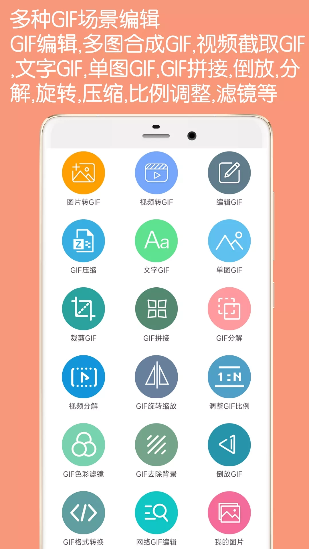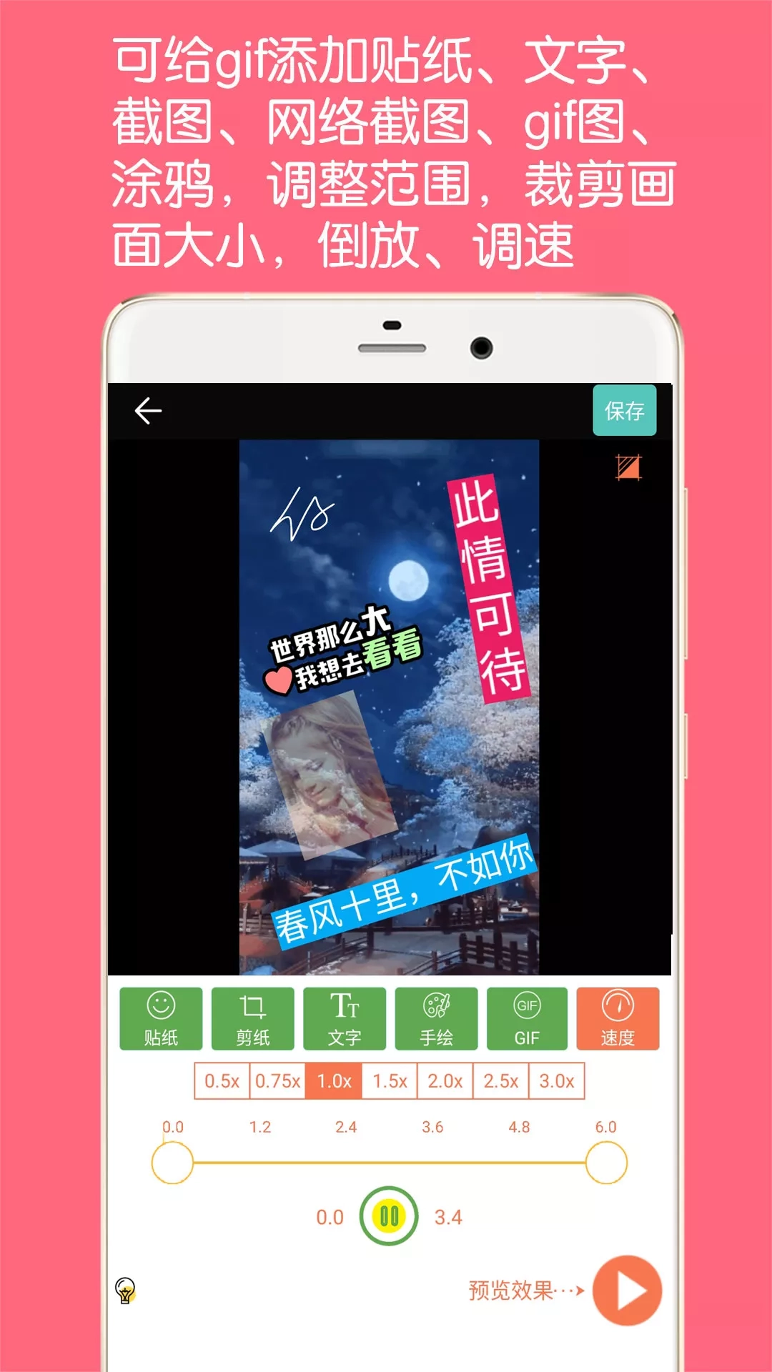 快速制作美化GIF动图,提供在线网络GIF编辑,提供图片转GIF动画,视频转GIF,编辑现有的GIF,相机录像转GIF,GIF倒放功能。 这不是简单的转GIF,在制作的过程中你可以随意添加你想要的图片,艺术文字,gif,表情到GIF中的任意位置和设置任意时间显示。你还可以调节GIF生成的像素大小,控制帧的播放速度(变快变慢),从而控制GIF的体积大小。 特点: 1、生成的gif高清 2、图片转GIF时智能优化图片大小 3、视频剪切随意选取,随意快进快退预览 4、视频不仅可以剪切长度还可以剪切部分画面 5、可添加任意数量的文字、贴纸、自定义图片、GIF图片到要制作的GIF中 6、可以在GIF中添加多张GIF实现画中画效果 7、可任意设置贴图文字在GIF中显示的时间,类似电影字幕效果 8、可以调节GIF倒放功能 9、快速明了的生成过程,直观了解GIF生成的进度 10、一键分享到朋友圈QQ好友微博等应用中