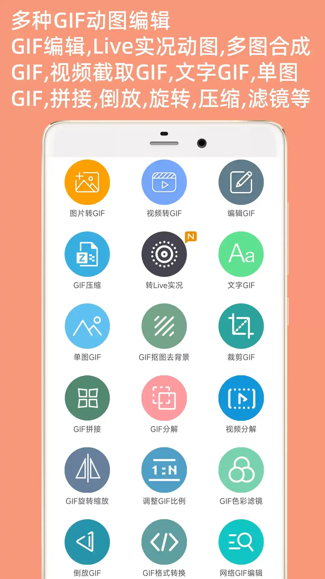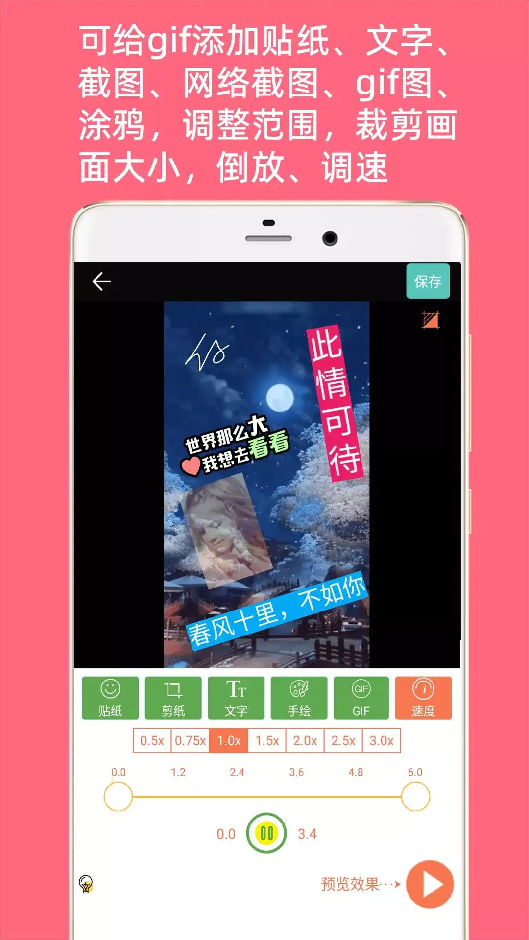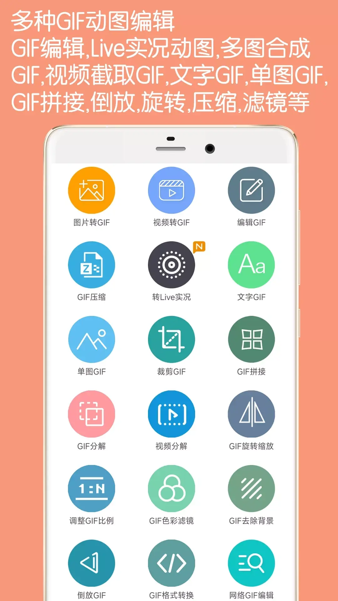 快速制作美化GIF动图,提供在线网络GIF编辑,提供图片转GIF动画,视频转GIF,编辑现有的GIF,相机录像转GIF,GIF倒放功能。 这不是简单的转GIF,在制作的过程中你可以随意添加你想要的图片,艺术文字,gif,表情到GIF中的任意位置和设置任意时间显示。你还可以调节GIF生成的像素大小,控制帧的播放速度(变快变慢),从而控制GIF的体积大小。 支持视频转Live实况图(即动态照片),打造你的专属Live图。 特点: 1、生成的gif高清 2、图片转GIF时智能优化图片大小 3、视频剪切随意选取,随意快进快退预览 4、视频不仅可以剪切长度还可以剪切部分画面 5、可添加任意数量的文字、贴纸、自定义图片、GIF图片到要制作的GIF中 6、可以在GIF中添加多张GIF实现画中画效果 7、可任意设置贴图文字在GIF中显示的时间,类似电影字幕效果 8、可以调节GIF倒放功能 9、快速明了的生成过程,直观了解GIF生成的进度 10、视频转Live实况动图