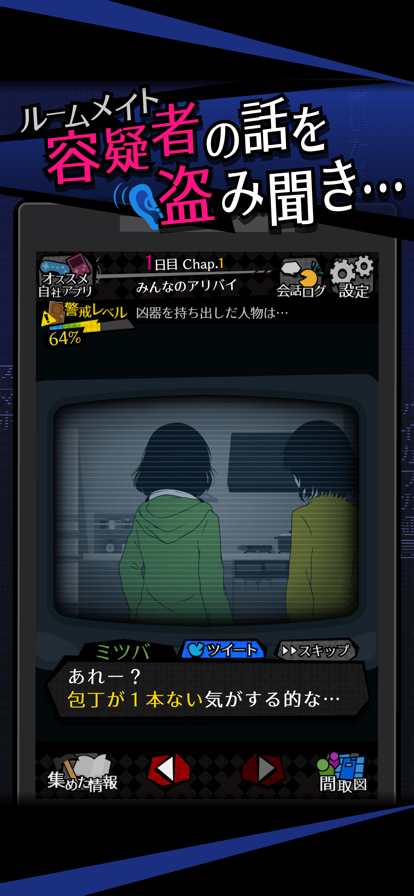◆謎解き×監視ノベルゲーム◆ シェアハウスで暮らす男女6人。 ある日、ルームメイトの『誰か』に襲われた。 ……自分の命を守るためなら、 ――今日も僕は監視する。 ◆ゲームの目的◆ ・ルームメイトの行動を監視して、自分を襲った【襲撃犯】を探し出そう。 ◆監視パート◆ ・「監視する」と「調べに向かう」の2種類の行動が選べます ・「監視する」と人の行動を見たり会話を盗み聴きすることができます ・「調べに向かう」とルームメイトと直接会話して探ることができます ■■■ルームメイトを警戒せよ■■■ ・ルームメイトが、突然アナタの部屋を訪れることがあります ……くれぐれも監視がバレないように、うまくかわしましょう ・数々の行動のなかで、選択を迫られることがあります ……時には生死にかかわることも ◆事前対策パート◆ ・監視や探索の後は、自分の命を守るための事前対策に移ります ・監視パートで手に入れた証拠や情報から推理して、犯行計画を阻止しましょう ・もし間違えると……? このシェアハウスの中に、俺の命を狙っている人物がいる・・・。 ―俺たち、友達じゃなかったのか? ※この物語はフィクションです。実在する人物および団体とは一切関係ありません。