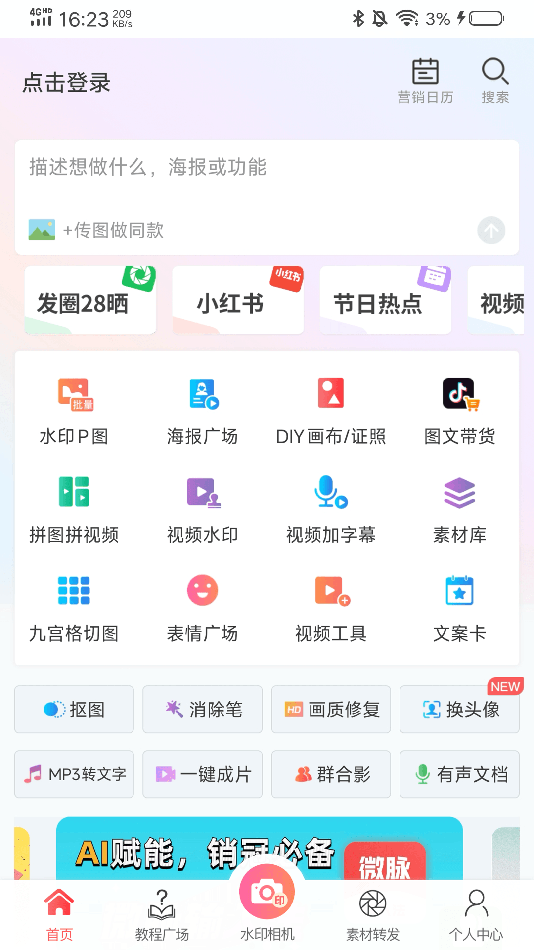 微脉水印相机,原名微商水印相机,品牌升级,一站式服务,强大无极限!<br>海报拼图、视频拼图、营销日历、视频水印、图片批量水印100张,画笔、马赛克、箭头、全屏水印,文章制作功能,团队素材转发,微铺、微课堂!<br>1.支持N多在线水印模板!<br>2.支持从相册上传logo作为水印!<br>3.一次处理100张,保证图片清晰度!<br>4.支持文字水印,修改字体、颜色、透明度!<br>5.单张模式和批量模式,随意摆放不同图片上的水印位置;<br>6.支持画笔、马赛克、箭头、圈点等功能。<br>7.支持文章制作功能;<br>8.营销日历功能 提供热点素材