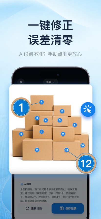 AI精准识别,一键清点,让计数变得如此简单! 你是否还在为大批量物料清点而烦恼?手工计数耗时长、易出错?试试“拍照点数神器”,一款基于AI智能识别的专业计数工具,帮你秒级完成钢筋、圆管、圆木、砖块等各类物料的快速统计,准确率高达“High”级别,省时省力更省心! 核心功能: 【AI智能识别,秒级计数】 运用先进的图像识别算法,自动扫描图中物体端面,精准识别数量,支持钢筋、圆管、圆木、竹签、包裹等多种常见物料,无需手动标记,一键出结果! 【手动灵活修正,计数更精准】 AI自动计数后,可手动“点击标记删除,点击空白添加”,轻松修正个别误判或遗漏,确保最终数量完全准确,满足高精度作业需求。 【历史记录随时查,追溯方便】 自动保存每次识别记录,包含物料类型、数量、时间等,方便随时查看、比对或导出,工作管理更清晰。 【操作简单,快速上手】 打开应用→选择物料类型→拍照→AI自动计数→手动微调(可选)→保存记录,轻松四步完成清点,无需专业技能。 适用场景: 建筑施工:钢筋、钢管、砖块数量统计 仓储管理:圆木、竹签、包裹库存盘点 生产质检:零部件、原料批量清点 日常记录:任何需要快速计数的场景 拍照点数神器 致力于用技术提升效率,将繁琐的人工计数转化为智能、便捷的拍照体验。无论是工地、仓库、车间还是日常使用,它都是你随身的高效计数助手!