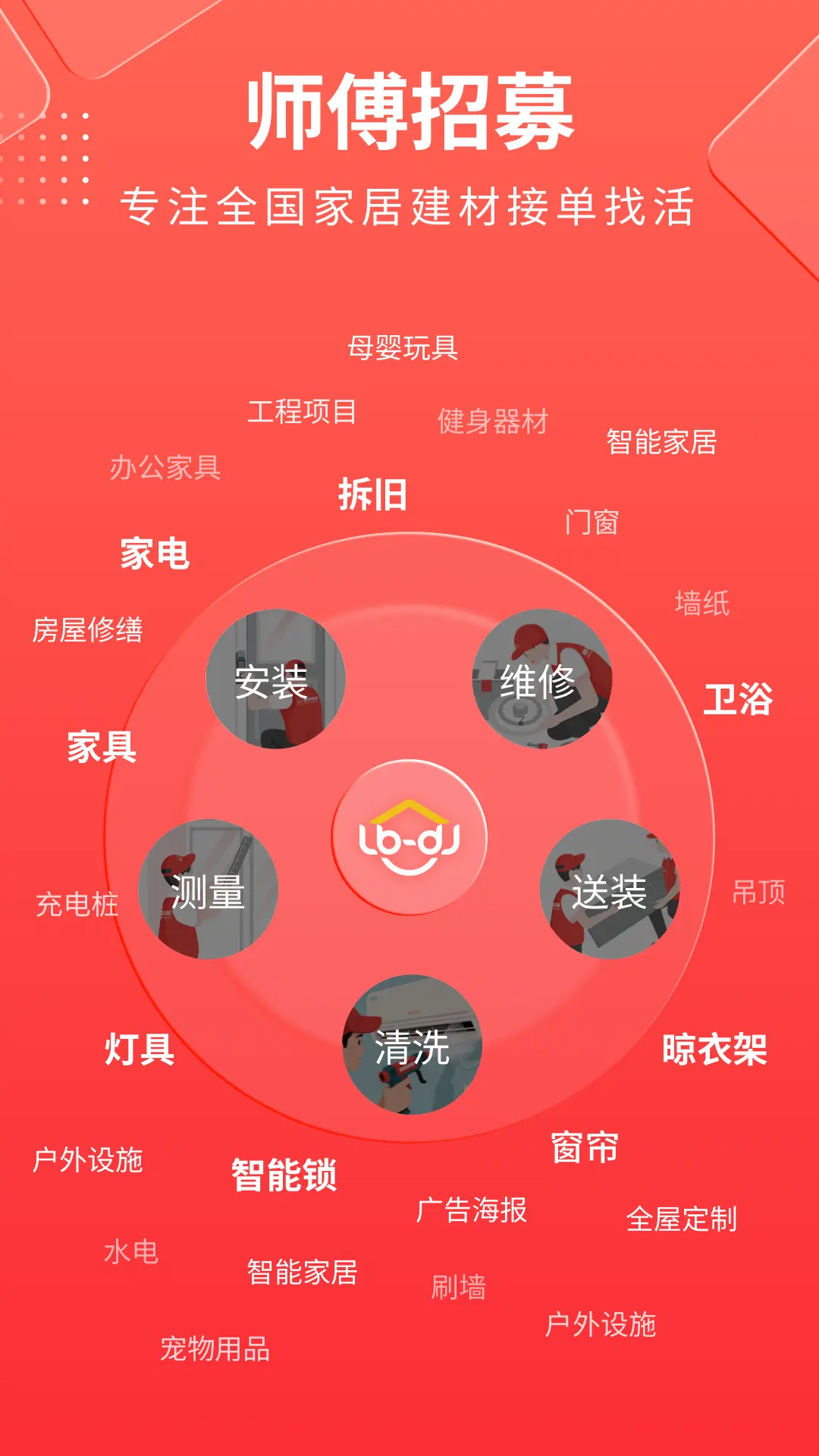 鲁班到家师傅版,是鲁班到家集团专为全国家居建材安装师傅量身打造的一款接单APP。<br>自2015年7月成立以来,鲁班到家始终秉持”让蓝领被尊重,让服务更值钱”的使命,致力于构建高价值的蓝领技工服务共享平台,助力拥有安装、维修、量尺、送装、清洗、保洁、疏通等专业技能的师傅群体提升服务水平、增加收入、塑造个人品牌,实现自我价值。<br><br>【热门工种全覆盖】<br>1. 网购订单:涵盖安装、维修、送装、量尺等服务<br>2.便捷生活:提供家电清洗、家具养护、人力搬运、同城配送等项目<br>3.建筑装修:包括装修设计师、泥瓦工、木工、水电工、油漆工、拆旧工等工种<br>4.汽修服务:开展汽车保养、音响改装等业务更多丰富工种,等您挖掘...<br><br>【平台优势】<br>1.海量订单:<br>业务遍布全国,覆盖全国4万多个街道,与300多万家居建材商家达成合作关系,订单长期稳定。<br>2.商家类型多:<br>平台聚合了家具、家电、卫浴、晾衣架、灯具、智能锁、门窗、窗帘、房屋修缮、健身器材、充电桩、广告海报、安防设备、壁画/墙纸、吊顶/墙板、全屋定制、宠物用品、瓷砖、儿童玩具、供暖、户外设施、乐器、母婴玩具、汽车养护、人力工、商用厨房、刷墙、水电线路、智能家居、工程项目等数百万家居商家&千万家庭用户的服务需求,师傅随时随地即可实现服务交易<br>3.接单自由:<br>接单模式多,自主报价、标准一口价、总包指派,师傅可根据自己时间安排、订单信息、服务距离等自由接单<br>4. 免费入驻:<br>师傅入驻不存在加盟费、入驻费等强制费用,只要你专业就能在这里发光<br>5. 担保交易:<br>平台拥有在线担保交易体系,商家付款后服务,杜绝拖债、赖债的现象<br>6. 技能提升:<br>平台高度关注师傅职业发展,精心打造“鲁班课堂”通过线上+线下结合的方式,为师傅们提供免费且专业的技能培训,助力打造全能标杆师傅<br>7、在线客服:<br>遇到问题别担心!专业人工客服实时在线,快速响应并解决服务纠纷/维权/钱款/订单/发货等各类问题<br><br>【平台功能】<br>1、就近派单:系统智能推送周边优质订单,保障师傅匹配高质量订单。<br>2、自主报价:自主报价、标准一口价,师傅可根据订单信息自由选择。<br>3、订单管理:订单管理、日程安排界面展示简洁清晰,帮助师傅更好的规划行程安排。<br>4、口碑打造:从师傅服务质量、次数、好评率、预约及时率等多维度服务数据全方位展示,助力师傅打造好口碑,让好师傅单量不断。<br><br>如有任何问题或建议,随时通过以下方式与我们联系,我们会认真对待每一条反馈,努力为师傅们提供一个更加优质、便捷的服务接单平台!<br>官网 : https://www.lbdj.com/ <br>微信公众号:鲁班到家师傅版<br>小程序: 鲁班到家接单版<br>服务热线: 400-9305-000