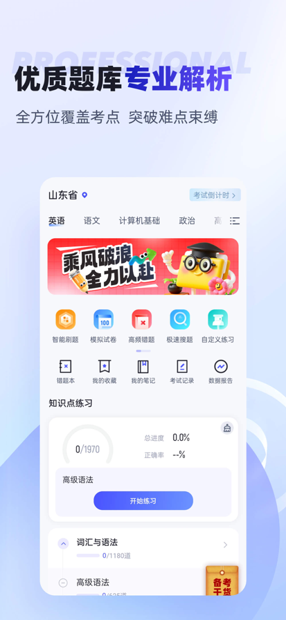 《学位英语聚题库》专为成人高等教育学位英语考试(成人英语三级)考生设计,覆盖全国31省市考试大纲。 整合海量真题资源、系统化课程及智能化学习工具,帮助考生精准突破词汇、语法、阅读及写作四大核心模块,全面提升考试通过率。 核心功能特色: 1、真题模拟考试系统 收录近5年全国及各省市真题卷(含北京、广东、上海等地方卷),每年更新率达90%。 2、专业视频课程学习 配备考点精讲视频:由资深教师解析语法难点、阅读解题技巧及写作模板应用。 课程模块化分类:按词汇、语法、阅读、写作划分。 重点章节配套习题:即时检验学习成果,巩固知识点掌握。 3、科学每日背单词计划 分级词库:5000+高频词汇按考试出现频率分级排序,优先掌握核心词汇。 智能记忆算法:基于艾宾浩斯遗忘曲线定制每日任务,自动安排复习节点。 情景化学习:词汇搭配真题例句及同义词扩展,强化实际应用能力。 适用人群 自考、成考、网络教育等申请学士学位的考生。 备考时间有限需高效提分的在职学习者。 需系统强化词汇基础或应试技巧的用户。