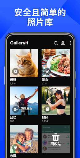Galleryit是一个适用于<b>所有Android设备</b>的免费图库应用。<br><br>你可以用它轻松<b>查看、分类并编辑</b>你的照片和视频。<br><br>现在就来下载这个全能的<b>照片管家</b>,随时随地离线整理你的文件吧!<br><br><u> GALLERYIT 的主要功能</u><br><br>🌄 <b>多合一的照片库</b><br>Galleryit能让你轻松查看任何格式的文件:JPEG、GIF、PNG、Panorama、MP4、MKV、RAW等。它还支持以幻灯片的方式展示图片,并支持自定义幻灯片的播放间隔时间。<br><br>🔒 <b>绝密的照片&视频保险箱</b><br>有一些私密的照片或视频不想被别人看到?那就用这个绝对隐私的照片保险箱来锁定你的照片、视频、文件和文件夹!用PIN码/图案/指纹锁安全地保管你的私密文件,并通过军用级加密保护你的隐私100%安全。<br><br>🗑️ <b>恢复已删除的照片和视频</b><br>不小心删掉了一张珍藏的照片?不用担心,所有删除的文件都会被自动移至回收站,而且只需一键就能恢复至原始位置!你还可以选择直接永久删除文件,节省设备的存储空间。<br><br>🔍 <b>快速&强大的文件搜索</b><br>*智能分类:根据时间、地点和文件类型进行分类。<br>*快速搜索:根据拍摄时间、文件名称、文件大小和最后修改时间来筛选文件,快速定位你的目标文件。<br><br>🗂️ <b>简便的文件管理</b><br>*创建文件夹来分类管理你的照片和视频。<br>*通过电子邮件、信息和多种社交软件与他人分享。<br>*将喜爱的图片设为主屏幕/锁定屏幕背景。<br><br>💼 <b>防卸载保护</b><br>Galleryit使用设备管理权限来防止其被陌生人、孩童或其他清理软件意外卸载。这样可以为你的照片和视频提供更安心的保护,再也不用担心文件的丢失。<br><br><u>即将推出的功能</u><br>🌟图片/视频压缩 – 多种压缩尺寸和像素供你选择,轻而易举节省内存。<br>🌟支持在图片上添加文本、趣味贴纸,还有磨皮美颜等功能,敬请期待!<br><br>*Android 11的用户,需要开启“所有文件访问权限”来确保文件加密、管理等功能的正常使用。<br><br>我们一直致力于为用户带来更好的使用体验。如有任何问题或建议,欢迎联系galleryitfeedback@gmail.com。<br><br>图库 - 照片库<br>图库 - 照片库是一款便捷的相册应用。它可以打开各种格式的图片,便于写真保存和图片编辑。照片库还支持隐藏图片和视频的功能,你可以在相册中创建一个带PIN码的秘密照片库,隐藏图片和视频、保护隐私文件。<br><br>照片保险箱<br>照片保险箱是一个用于隐藏图片和视频的秘密照片库。 这个图库应用搭建了一个安全的存储空间,防止隐私泄露和写真意外删除。 此外,它还是一个易于操作的相册应用,便于写真分类、管理和编辑。 下载这个照片保险箱和秘密照片库,妥善保管你的珍贵回忆!