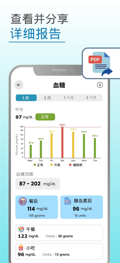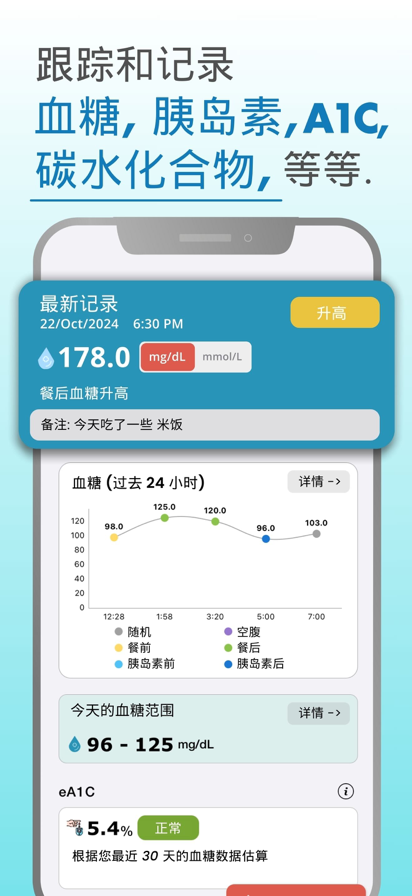 方便的血糖管理工具,通过它您可以更好的掌控血糖情况,尽快实现血糖控制目标。 功能: -根据时间段统计平均血糖、糖化血红蛋白(模拟计算),支持显示空腹,餐前,餐一,餐二,餐三,随机血糖的最高值、最低值、平均值 -新增血糖记录,包括记录日期、血糖值、用药、饮食、运动、饮水、相关照片等。 -查询血糖记录,在日历中方便的显示每日空腹,自动按日、按月查询血糖记录、支持通过关键词查询某日血糖记录。 -删除血糖记录,支持删除不需要的临时血糖记录。 -血糖报表,支持统计某个时间段的血糖情况生成各种图表,包括空腹,餐前,餐一,餐二,餐三,随机血糖-控糖情况,您可以通过打印或者通过邮件等方式发送给您的医生。 -控糖相关照片,支持单独查看饮食与血糖相关的图片,你可以方便的查看某天吃了某种食物对应的血糖是多少。 -数据备份,支持通过时间段导出血糖记录到Excel表格永久保存起来。 -系统设置,支持设置血糖单位或空调目标,您可以设置成当地的血糖单位和你的血糖控制目标 -使用反馈,通过它您可以随时随地的给我们反馈使用信息 无限制访问会员订阅 - 您可以通过该订阅无限制使用应用内所有功能。 - 订阅按月、或年收费,费用视所选订阅计划而定。 - 确认购买时会从 iTunes 账户扣款。 - 您可以在当前订阅结束 24 小时前关闭自动续订,否则将自动续订。 - 当前订阅结束前 24 小时内会从您的账户扣款续订,费用取决于您选择的计划。 - 用户可以管理订阅,购买后可以前往用户账户设置关闭自动订阅。 - 用户购买订阅后,任何未使用的免费订阅时间将会作废。 隐私权政策: http://www.dazhuogroup.com/bloodsugar/privacy_statement_en.php 使用条款: http://www.dazhuogroup.com/bloodsugar/terms_of_use_en.php 免责声明: 本软件仅根据您提供的数据收集展示,不能作为诊断依据,做出任何医疗决定时,必须去专业的医院机构寻求医生的建议。