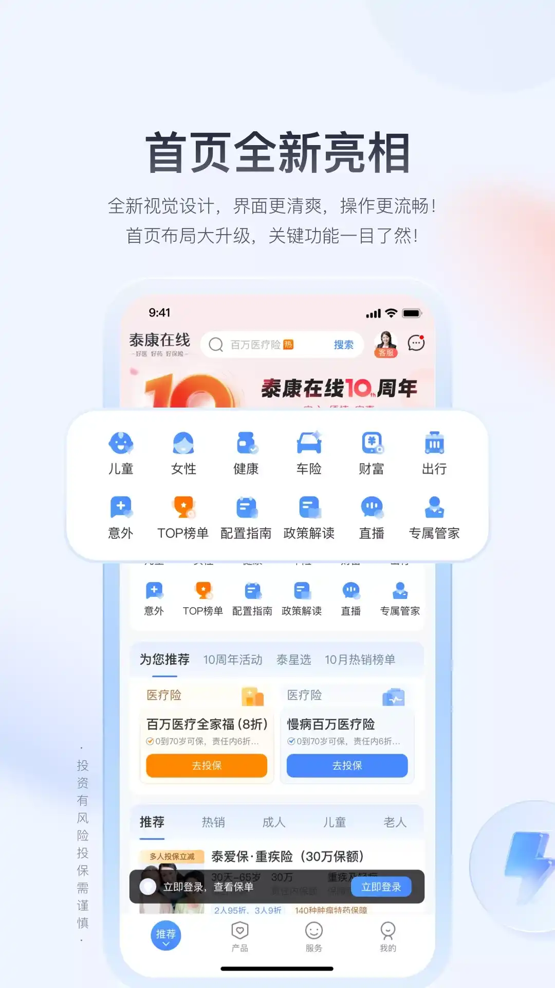 “泰康在线”将保险科技应用于互联网保险业务的创新与开拓,整合线上、线下保险服务,为用户提供更实惠、更安心、更便捷的保险产品及服务,构建“活力养老、高端医疗、卓越理财、终极关怀”四位一体的互联网大健康生态圈。 【保险商城】 60秒线上极速投保,智能保险顾问7*24提供个体化保障建议; 提供互联网财产险、境内/境外旅行险、健康险、意外险、车险和投资连结险等40余款创新型保险产品; 【健康管理】 整合线上线下医疗健康服务资源,为客户提供在线问诊、寻医问药、快速就医等全方位健康管理服务; 通过HealthKit获取健康及体能数据,依托泰康在线自主研发的智能定价引擎,实现差异化保费定价; 【财富管理】 全明星产品盈e生投资连结保险,背靠强大投研团队-泰康资产; 6大经典账户,助力您进行全方位的资产配置; 投资收益,随时查询,账户转换,尽在掌控; 【会员服务】 保单服务弹指间轻松搞定,在线申请,极速理赔,安心无忧; 全新会员成长体系,9大等级30余项会员增值权益,倾情回馈,感谢有你; *****关于泰康在线***** 首家由国内大型保险集团发起成立的互联网保险公司,也是国内首家通过保险类CA认证的网站,泰康在线连续三年蝉联“2018胡润新金融百强企业”。 *****联系方式***** 官网地址:www.tk.cn 微信公众号:taikangonline 服务热线:40000-95522