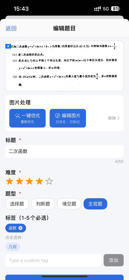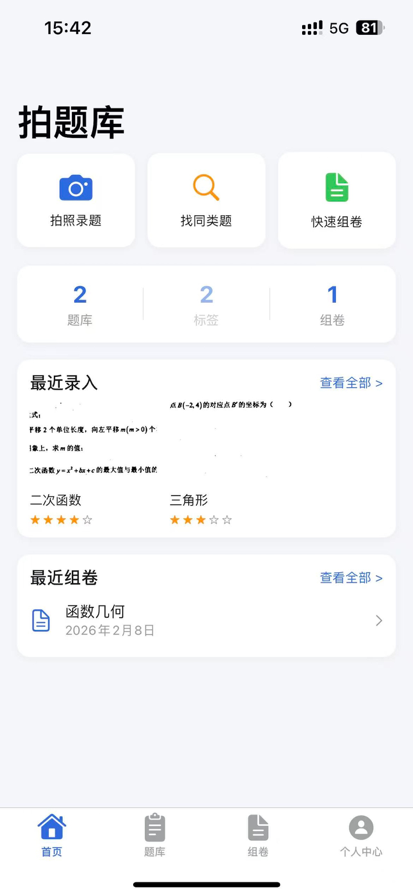 拍题库是一款专为学生和教师设计的题库管理与组卷工具。拍照即可录入题目,轻松整理、高效复习、快速组卷。 拍照录题,秒级入库 对准题目拍一张照片,自动裁剪保存到题库。告别手抄笔记,错题整理从此高效。 标签分类,井井有条 自定义标签,按科目、章节、难度、题型灵活分类。再多的题目也能快速找到。 智能搜索,精准定位 支持按标签、题型、难度等多条件筛选,快速找到目标题目。 一键组卷,专业导出 从题库中选题,自动生成排版整齐的试卷。支持 PDF 和 Word 格式导出,打印分享一步到位。 图片编辑,干净整洁 内置橡皮擦和序号标记工具,擦除多余内容、标注题号,让导出的试卷清晰美观。 会员尊享功能 · 一键优化:自动黑白增强、清理杂物、标注题号,一步完成 · 无水印导出 · 自定义试卷页头 · 批量打标签 隐私安全 所有数据存储在您的设备本地,不上传任何服务器,不收集任何个人信息。 无论是日常错题整理、考前刷题复习,还是教师出卷备课,拍题库都是您的高效助手。 使用条款(EULA):https://www.apple.com/legal/internet-services/itunes/dev/stdeula/