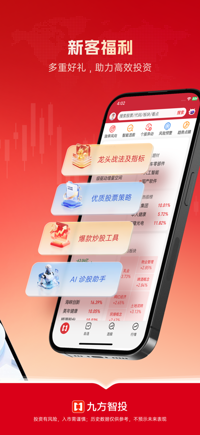 九方智投,新一代股票投资助手 我们为您提供智能股票证券投资咨询服务,特色指标快速选股,辅助决策,提升盘感。 【特色功能】 1.高效选股 AI诊股王:一键分析市场机会、技术趋势、资金流向、舆情和价值评估,助您把握投资先机! 风险情报站:8个维度监控个股,及时了解自选股潜在风险指数,降低踩雷风险。 龙虎榜:每日行情推演,识别一线游资,挖掘短线强势上涨机会。 大咖领路:线上机会教学,讲解案例方法,轻松选股,助力决策。 2.买卖信号提示 AI 顶底:智能择时,高低点一手掌握。 多空盯盘:动态监控23个技术指标的多空状态。 3.风口机会 热门板块:投资情绪实时追踪,板块机会不错过。 主力资金:看市场涨跌、大盘异动、资金流向,揭秘主力资金布局,主力进出一目了然。 头条资讯:热点题材,机会提醒,专业投资顾问深加工,音视频多种体验方式,带您寻找有价值的投资机会。 【功能亮点】 智能炒股:一站式解决方案,包括诊断、选股和交易方法,让您轻松掌握股市动态。 量化盯盘:利用量化模型评估市场情绪,捕捉关键变盘信号,及时提示投资建议,助您洞察市场。 可视化呈现:结构分析和数据可视化,让您轻松快速了解行情,功能操作简单有趣。 大数据分析:每日自动梳理上万条财经资讯,通过模型化大数据技术筛选重点内容,提供权威、及时、有效的信息支持。 智能推送:根据自选股的异动情况智能推送,助您把握机会和规避风险。 我们通过智能的搜索服务,精选炒股利器,结合市场讯息,探索个股背后的上涨逻辑,为您一键呈现。无论您身在何处,都能轻松投资。 风险提示:投资有风险,入市需谨慎。历史收益数据仅供参考, 过往业绩不预示未来表现。 为九方智投登录用户提供专业诊股服务 您的每个建议都是我们进步的动力!