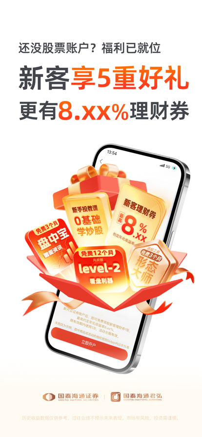 【国泰海通通财】7*24小时开户,权益多多,持续为投资者提供专业的金融服务。 炒股,理财,基金,一站式综合财富管理服务! 更短的时间,更快的决策,就在国泰海通通财! --------------智能矩阵-------------- 【智能盯盘】 股价预警、大事提醒,更有7大策略盯盘; 捕捉下单好时机,只为更轻松地投资 【智能账户】 盈亏一目了然,每日交易复盘; 6大维度洞察投资能力,工具课程匹配提升; 【智能客服】 7*24小时温馨守候,全天候响应专业服务体验; 【智能选股】 基本面、技术面、舆情、大数据选股,多维考察更专业; 【智能资讯】 个性化推荐热点资讯,您关心的才有价值; 【一键打新】 轻松一键自动打新,中签提醒不错过; -------------主打服务--------------- 【多市场品类交易】 支持A股、期权、OTC、场外基金等交易 【全品种秒动行情】 沪深港及全球行情秒速更新,畅享Level2十档行情; 股票、债券、基金、期货、外汇市场动态一网打尽 【精品理财产品商城】 严选公募、理财产品等,多样选择助力财富管理 【市场资讯全球热点】 24小时全球资讯滚动,第一时间把握市场脉搏; 海通研究所独家深度解读,为您的投资保驾护航 【随时刷脸开户】 7×24小时,单向视频验证不排队,一步到位绑定银行卡 【全业务办理掌厅】 支持48项4大类业务涵盖所有需求,快速办理无需等待 【联系方式】 在APP使用过程中,您有任何建议或遇到任何问题,都可以联系我们: 1、打开国泰海通通财,点击“客服” 2、拨打服务热线“95521” 温馨提示:理财有风险,投资需谨慎。请根据个人风险承受能力,理性投资。 新客好礼: 新客户通过国泰海通通财APP开立证券账户,可获得行情月卡12个月、盘中宝3个月、形态大师3个月、新手投资训练营、新客理财券一张。开户成功后,卡券将发放到通财APP上,限有效期内使用,活动即日起长期有效,具体内容以APP内所示为准。
