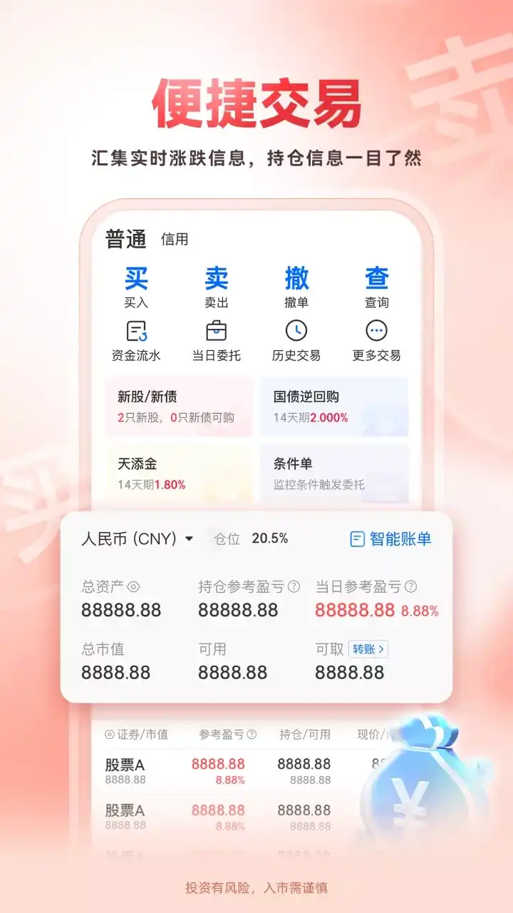 中山证券倾心打造第三代手机炒股理财软件,让股票投资更贴心! 特色介绍: 1、【极速开户】 7*24小时简单拍照开户,随时随地开启您的投资之旅 2、【一键换肤】 清新白、经典黑两款主题皮肤,全新界面、K线等设计深度贴合用户使用习惯 3、【自动理财】 账户闲置资金自动理财,理财份额可直接购买股票,理财、炒股无缝对接,让资金永不停息 4、【掌上业务】 掌上营业厅足不出户办业务,创业板轻松转签,个股笔记随时记录精彩,股价预警助您盯盘 5、【新股申购】 新股申购、查询、缴款一站式流程,港股通、新三板精彩纷呈 作为中国早期证券公司,中山证券拥有丰富的投资经验和专业的技术团队,为您的投资保驾护航。在移动互联网时代的今天,中山证券厚积薄发,将专业投资与互联网精神融合,不断创新、开拓进取,倾心打造了中山证券手机炒股软件。我们始终倾听投资者的反馈,始终关注市场的动态,因为有您,我们还会更好,欢迎所有投资者下载体验!