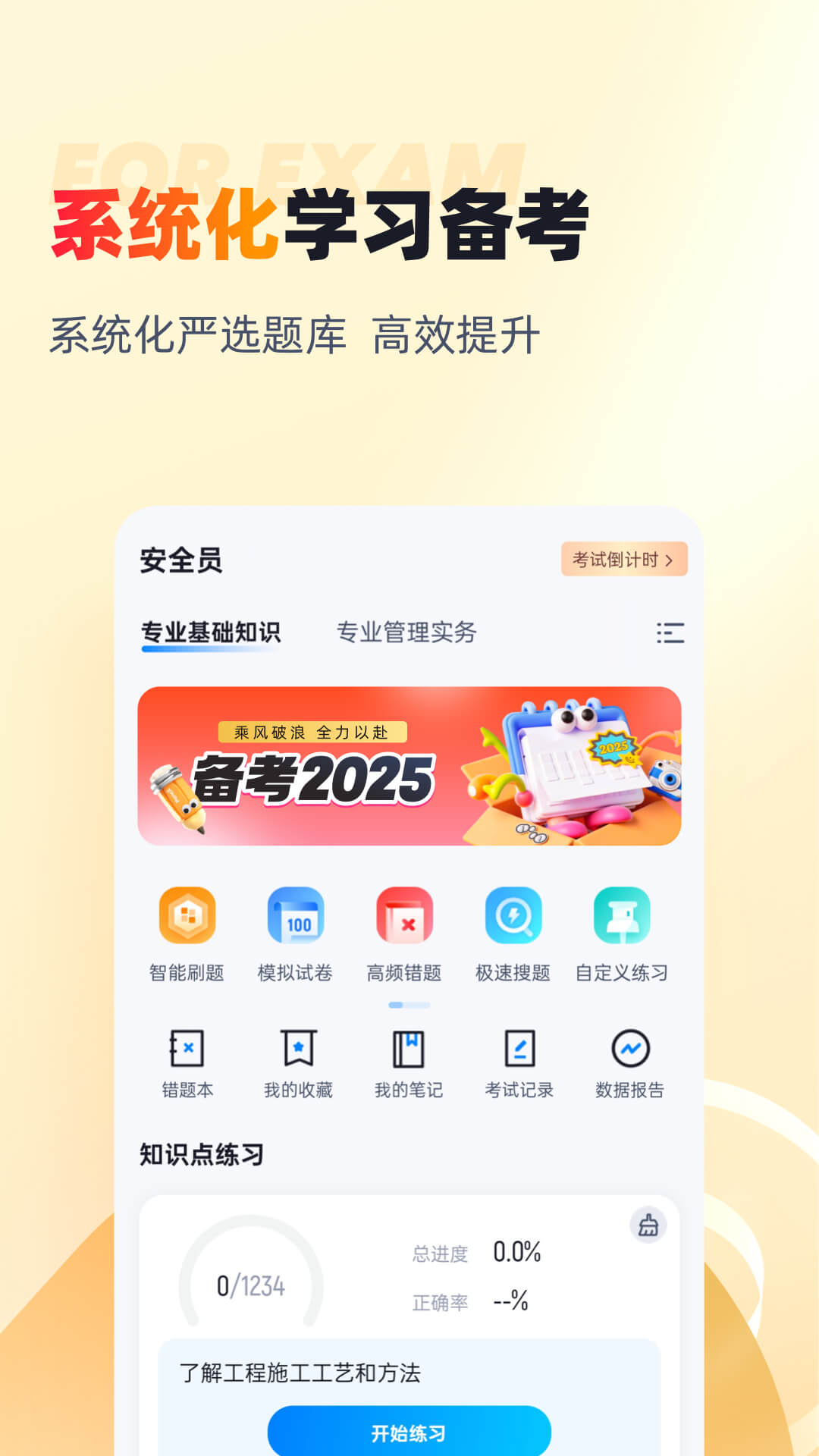 安全员考试聚题库——专业备考 精准训练 助力安全生产管理认证<br><br>备战安全员资格认证考试?安全员考试聚题库是您专业可靠的备考助手。我们提供权威精准的练习资源,助您系统掌握安全生产专业知识与管理技能,从容应对考试挑战。<br><br>真题模拟实战演练<br>应用内精选汇集历年考试真题及高质量模拟试卷,严格依据新考试大纲与安全规范精心编写。通过模拟考试功能,您可体验真实考场环境,进行全真限时测试。考试结束后,系统即时生成详细分析报告,清晰展示您在安全法规、安全管理、安全技术、事故处理等各模块的掌握情况。智能评估系统精准定位知识薄弱环节,帮助您明确复习重点和改进方向。<br><br>系统化知识点练习<br>我们依据考试要求将知识点科学分类,涵盖安全生产法律法规、安全管理体系、危险源辨识、事故应急预案、职业健康防护、安全操作规程、消防知识、现场安全检查等核心内容。每个知识点模块都配有专项练习题和详细解析,帮助您深入理解安全生产专业知识。您可以根据学习进度选择对应章节练习,巩固理论基础,掌握重点难点。<br><br>安全员考试聚题库集权威真题模拟与系统知识点练习于一体,设计科学,操作便捷。通过反复的实战演练和针对性训练,帮助您夯实专业基础,提升安全管理能力。应用内容持续更新,紧跟新安全法规和考试动态,是您备考复习、查漏补缺、提升通过率的专业工具。立即下载应用,开启高效备考之旅,为安全员职业发展奠定坚实基础。