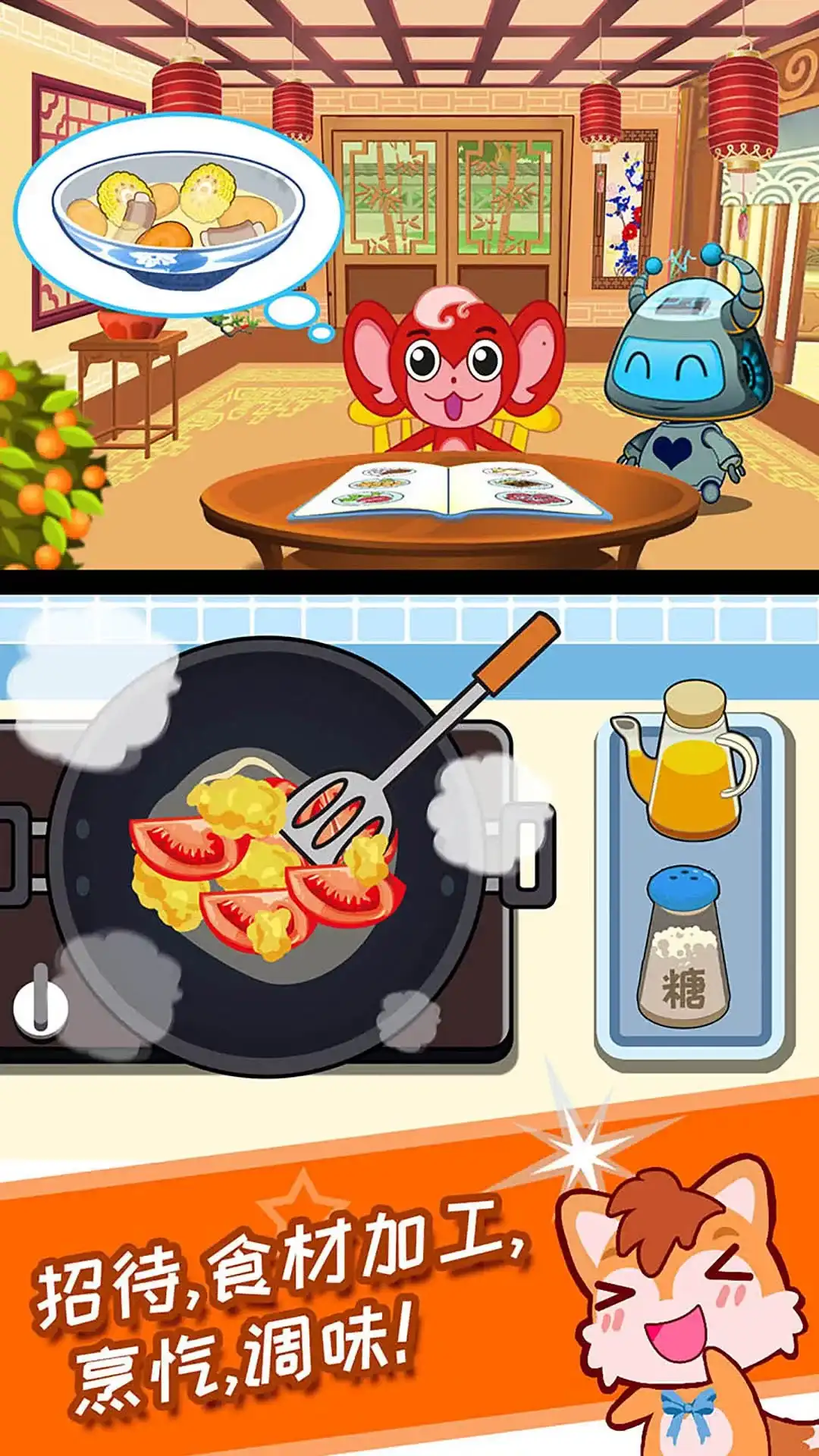 神秘的【宝宝机器人餐厅】来啦!快看看这次有美味的菜式吧! 香喷喷的西红柿炒鸡蛋;肥而不腻的土豆烧肉~ 还有隐藏的蛋糕和披萨等着你哟~ 想知道这些美味是怎么做的吗,快来大展身手吧! ——产品内容—— 【美味爆棚】宫爆鸡丁、白菜豆腐汤、茄角之恋、蚂蚁上树....荤素搭配,有菜有汤,汇聚各地美食,让你大饱口福! 【食材丰盛】牛肉、香菇、鸡蛋....绿色有机食材,综合搭配,吃出健康好身体! 【厨具齐全】炒锅、搅拌机、烤箱...满足你对厨房的所有想象! 【调料丰富】酱油、寂静...丰富的调料,刺激你的味蕾,锁住你的味觉! 【过程享受】招待客人、选菜、食材加工、烹饪、调味,制作心中完美料理! 【奖励金币】烹饪美食,经营餐厅,获得丰厚报酬,学习更多菜式!