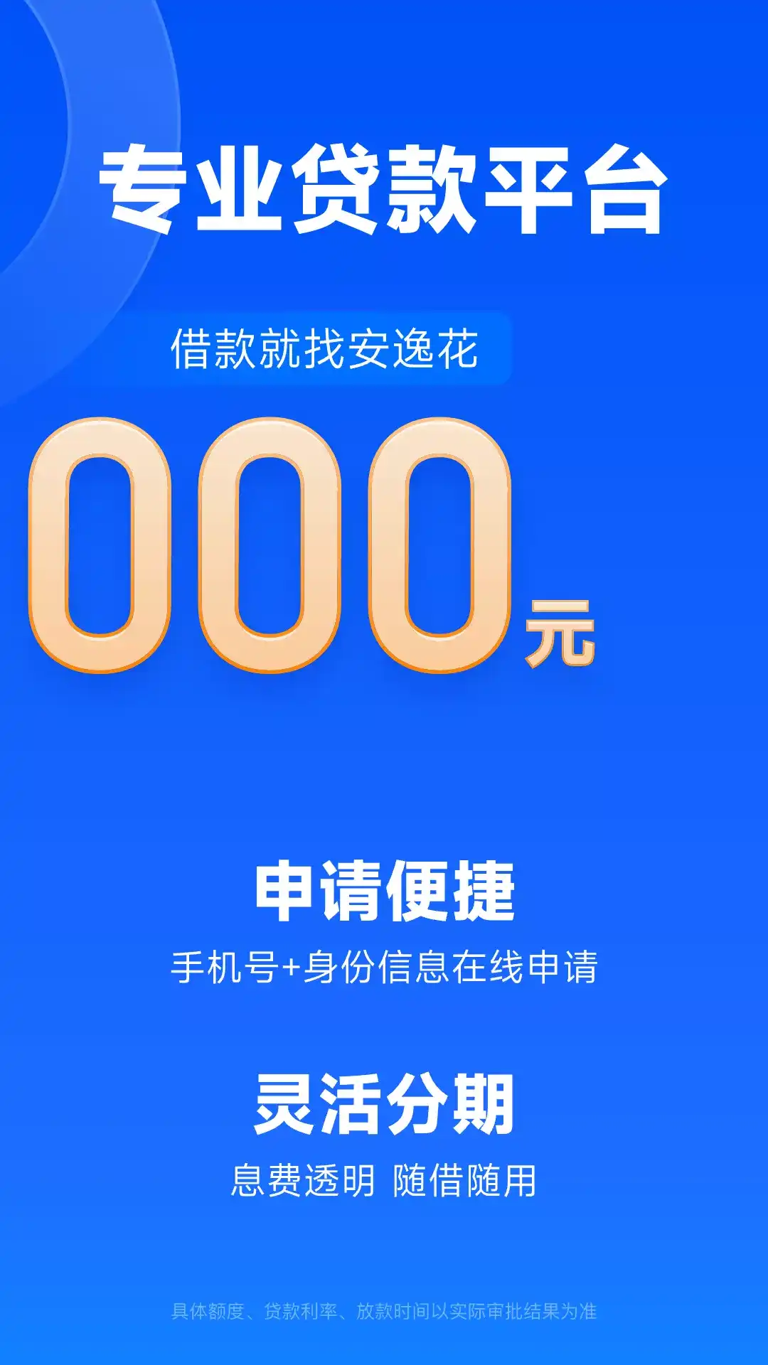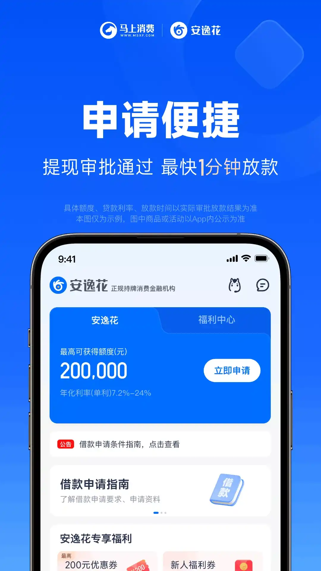 ◇贷款借款借钱分期,就找安逸花◇ 【额度高】信贷专业大平台,额度最高可达20万元 【更安全】持牌金融机构马上消费旗下产品,正规可信赖 【平台介绍】 安逸花-分期贷款信用借款快速借钱平台,为马上消费金融股份有限公司推出的,一款循环额度的贷款借钱产品,用户可以在额度范围内进行分期借款贷款,在享受安全、专业、智能、便捷贷款同时,可自主提现支付。 【产品特点】 1. 效率高:贷款全程线上,使用身份证+手机号即可申请 2. 操作易:借款进度随时查,还款操作方便快捷 3. 可循环:一次授信,循环使用,额度有效期为5年,年化利率(单利)7.2%-24% 4. 更专业:信用贷款,手机借钱(借款平台,贷款平台,小额借款,小额贷款,借钱平台)就找安逸花 【关于马上消费】 马上消费金融股份有限公司(简称“马上消费”)是一家经原中国银保监会批准,持有消费金融牌照的科技驱动型金融机构。 【资金来源】 资金来源于马上消费及/或其合作伙伴 【联系我们】 官网:www.msxf.com 客服电话:95090 【温馨提示】 贷款有风险,借款需谨慎,请依据个人能力合理贷款,理性消费,避免逾期