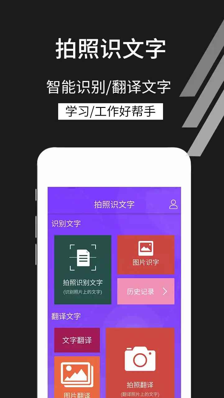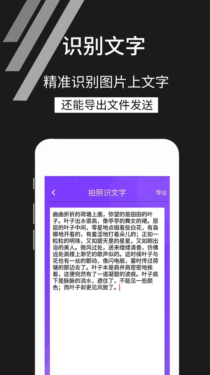 【拍照识文字】可以拍照或者从相册选取图片,选择相应的分类,即可快速精确的完成图片识别。拍照识文字是一款精专文字识别扫描王,准确识别中英日韩等12国语言文字,识别准确率高达99%,高效图片文字提取工具。 快速识别图片/PDF/文档/证件/名片等,精准识别/无广告/体积小/操作简单,结果一键导出TXT/PDF/高级翻译,专业OCR文字扫描识别软件。 通过对含文字的书籍、海报等进行拍照,识别其中的文字,并支持翻译多国语言,方便用户理解文字含义。 扫描文件&文字识别&PDF编辑&拍照翻译&证件照制作 ——【应用特色】—— 1,识别准确率高达99%。 2,文字识别支持12国语言。 3,快捷拍照翻译,图片内容一键翻译。 4,识别结果智能分行。分段,一键生成文档。 5,无广告、操作简单、内存小。 6,支持识字搜索,人声朗读。