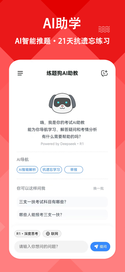 三支一扶考试备考刷题软件! 高品质课程+海量题库+AI助教,三位一体备战三支一扶考试~ AI助学焕新上线,章节刷题结合三支一扶考试大纲,AI智能推题精准定位薄弱环节,结合艾宾浩斯遗忘曲线研发"21天抗遗忘训练",让知识点过目不忘! 三支一扶考试备考王牌APP,大家都在用的三支一扶备考助手!专为备考三支一扶的同学提供题库练习,本软件涵盖了章节练习,历年真题,预测试卷以及题目解析,每个科目独立题库,分类明晰,结合AI智能刷题、AI解析拓展、错题巩固、统计分析、模拟考试等多功能模块,在复习过程中查漏补缺,提高您的综合分析能力、拓宽知识面。 死了都要爱的三支一扶备考刷题体验,独得用户恩宠,三支一扶考试用户备考都在用题库类学习APP! 【核心功能】 >>练习: 【章节练习】每个科目独立章节题库,按考试大纲分模块突破,实时更新,双轨并进。 【历年真题】收录近几年三支一扶考试真题,与三支一扶考试亲密接触。 【高频题目】大数据分析三支一扶考试高频题目,三支一扶备考重点难点一网打尽。 【错题巩固】独特错题巩固功能,清除三支一扶备考路上的顽固障碍。 【AI解析拓展】每个题目新增AI解析拓展,帮助您全面了解知识点。 【AI智能推题】个性化推送薄弱知识点+顽固错题+抗遗忘特训题。 >>指南: 备考资讯,官方通知,复习技巧尽在三支一扶练题狗。 【技术支持】鼎维云课堂 【联系我们】 微博:@练题狗 微信:liantigouapp 客服电话:+8618290463382 (工作日9:00-18:00)