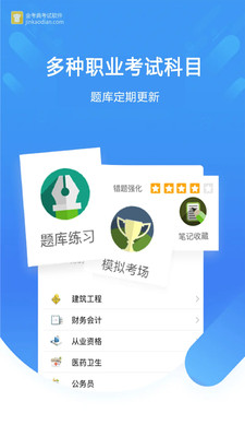 新大纲题库,陆续更新,帮您应对变化的考试! 有配套的章节习题,历年真题,软件预测模拟题,自动更新,非常适合备考执业考试的小伙伴们。 金考典-新版-在线版本: 1. 无需下载题库,需联网做题; 2. 不限设备使用,激活科目后,不同设备登录账号即可做题; 3. 自动同步做题记录; 4. 自动更新题库; 【包含科目】 建筑工程: 一级建造师、二级建造师、一级/二级造价工程师、一级/二注册建筑师、安全工程师、监理工程师、消防工程师、消防设施操作员、试验检测师(含助理)、房地产估价师、房地产经纪人、房地产经纪协理、咨询工程师、八大员、安全员、土木/电气/岩土/质量/环保结构工程师、公用设备、国土城乡规划师测绘师、环境影响评价工程师; 财务会计: 初级会计、中级会计、注册会计师、税务师、审计师、初级/中级/高级经济师、统计师、资产评估师; 公务员: 国家公务员、省公务员、事业单位公开招聘、军队文职、国家电网、三支一扶; 医学卫生: 执业医师、执业药师、健康管理师、卫生招聘、护理学、护士资格、护师、主治医师; 从业资格: 教师资格、教师招聘、社会工作者、软件水平考试、法律职业资格(原司法考试)、期货从业、基金从业、证劵从业、银行从业、银行招聘、人力资源管理师、导游证、心理咨询师; 学历类: 研究生入学、成考(专升本、高起点)、自考。 【应用功能包括】 1、收藏夹:可以收藏自己的喜欢题目; 2、错题集:里面容纳了你的知识盲点; 3、互动笔记:记录自己的学习体会,也可看别的考生的笔记; 4、记忆管理:根据艾宾浩斯记忆法定制做题结构,加深你对知识点的记忆; 5、同步记录:不同手机电脑可以同步做题记录; 6、组卷模考:对您的做题、未做题、难题等练习数据的智能分析,提供智能组卷模考。 执考路漫漫,且行且珍惜。 在这里,你不是一个人在战斗!