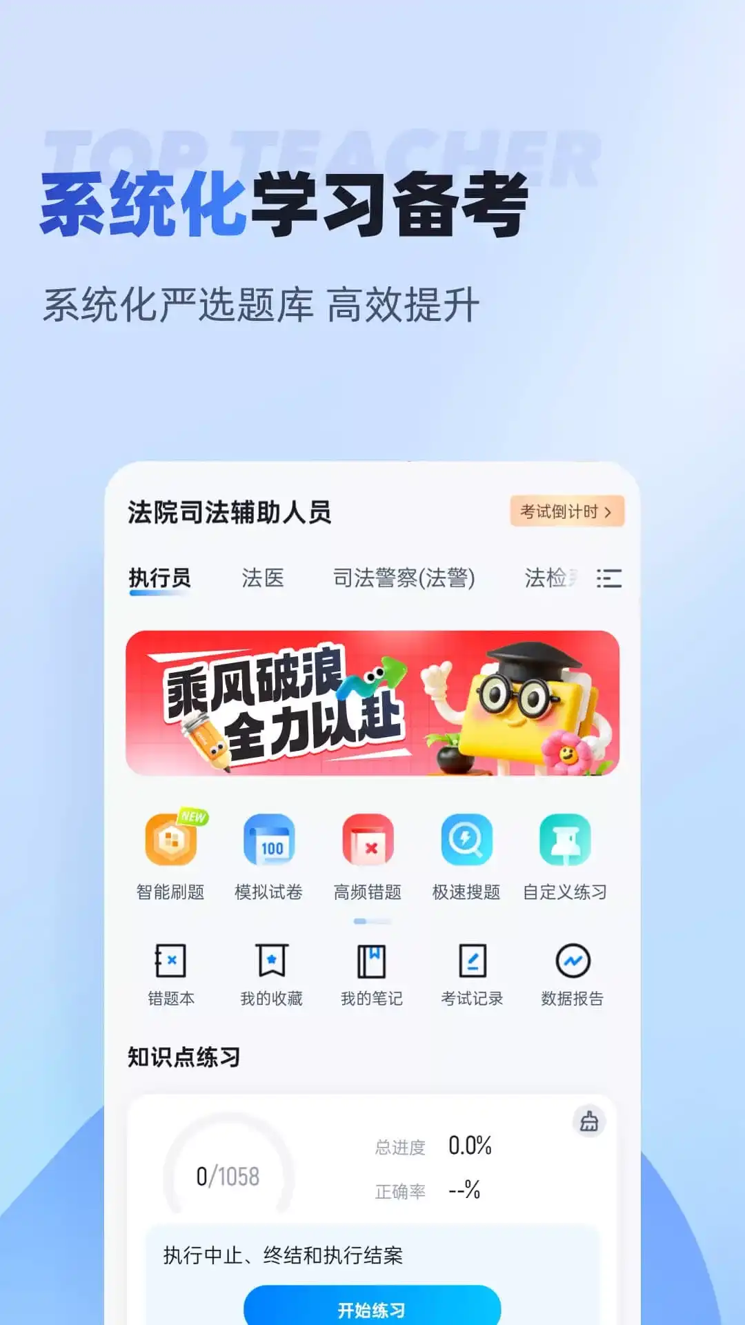 法院司法辅助人员考试宝典 法院司法辅助人员考试聚题库包含了包含了书记员、法医、司法警察(法警)等课程的历年真题集模拟试题题型,题库中的试题全真模拟真实的考试,是各位考生学习乃至通过考试的好帮手。 [强大的搜题功能] 法院司法辅助人员题库新增搜题功能,碳排放管理员考试中的疑问一搜便知,更支持语音和拍照搜题。 [高质量的模拟考卷] 法院司法辅助人员APP新增模拟考试功能,法院司法辅助人员可按照自我练习的考点选择相对应的模拟试卷,也可选择搭配好的模拟整卷考试。 [多样式的刷题模式] 法院司法辅助人员题库内含考点练习,通用卷以及地区卷模拟练习,以及按照固定考试比重的随机式的抽题的真题考场,成绩单实时记录考试数据,一点一滴的反馈考生近期学习状态以及自我正确率的提升,给予考生通过考试的信心。