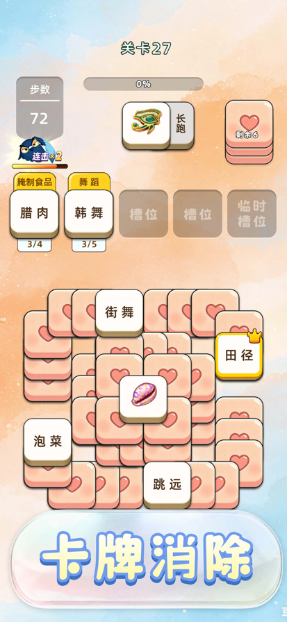 看看桌面上那些乱糟糟的卡牌,感觉自己的强迫症都要犯啦! 别担心,现在就是你大显身手的时刻! 这儿有一场奇妙的卡牌归类之旅,正等着你来挑战。你需要做的很简单:动动你聪明的手指,将五花八门的卡牌们分门别类,把它们一一送回正确的位置。从杂乱无章到井井有条,每一次成功的整理都会带来满满的治愈感和成就感! 趣味分类,万物皆可成牌 无论是可爱的动物、诱人的美食,还是生活中的日常用品,在这里都能变成一张张等待你归类的卡牌。根据“皇冠牌”的指引,开动脑筋,将它们放到正确的牌堆中吧! 轻松拖拽,指尖丝滑体验 操作超级简单!只需轻轻一点,然后拖动卡牌到目标位置即可。随时随地都能来上一局,享受解压又益智的轻松一刻。 步步为营,挑战你的策略 注意啦,你的每一步操作都会被记录!你必须在规定的步数内完成所有卡牌的分类。是深思熟虑找出最优解,还是随心而动?这不仅考验你的知识储备,更是对你逻辑思维的一次大挑战! 准备好了吗?立即加入,开启这场益智又解压的卡牌狂欢,看看你能闯到第几关!