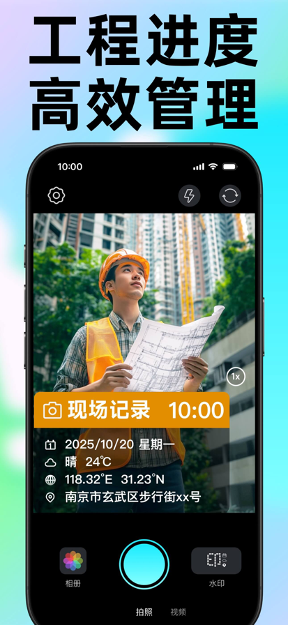 拍照片、拍视频,都能加水印。 水印上自带真实时间地点,防篡改! 好用的工作拍照App,各行业工作者的共同选择。 【适用场景】 工作质量记录、考勤打卡、物业工作记录、房屋验收、快递外卖、外出培训、会议记录等 【丰富的水印类型】 工作、时间、地点、经纬度、海拔、天气、心情、日记、特色等 【专业水印模板】 * 考勤打卡:真实时间地点无法篡改 * 工作记录拍照:物业管理、建筑工程管理、执勤记录、品牌宣传、会议记录等工作记录专属模板 * 实时更新:水印可自动更新为实时的日期、地点、天气等信息 * 自定义水印内容:可自由开关和编辑水印内容选项 一. 付款: 用户通过 iTunes 账户扣款, 用户确认购买后即付款. 二. 续订: 用户 iTunes 账户在到期前的二十四小时内扣费, 增加相应的订阅周期. 三. 取消续订: 如需取消续订, 进入"iTunes Store 与 App Store" —> 点击 "App ID", 进入 "账户设置" 页面, 点击 "订阅", 选择取消订阅即可. 四. 隐私协议: https://docs.qq.com/doc/DVHJBZnBTemFzY1N5 五.使用条款: https://docs.qq.com/doc/DVGZHeUxaQ1ZwZFdW
