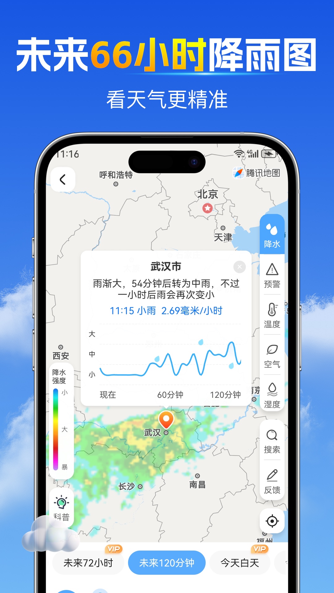 彩云天气是基于气象雷达图,利用人工智能算法进行分钟级降水预报的全球先驱者。<br>「分钟级降水预报」<br>两小时内超精准的分钟级降水预报,及时调整自己和家人的出行计划。<br>「全方位天气提醒」<br>无论是你的当前位置,还是收藏的地址,降水时间、预警信息、天气早晚报都支持自定义订阅!<br>「全球气象雷达动图」<br>700部气象雷达构建的AI预报网络,让你在祖国或异国他乡都能看到实时的降水动态。<br>「全国空气质量动图」<br>凉风起天末,雾霾意如何?等风来的闲暇时光,不如看看雾霾的走势。<br>「台风实时追踪」<br>每个台风都有一个美丽的名字,年年来此,却上演着不同的故事:强度、路径、生命史……<br>「街道级精准定位」<br>都说气象万千,那每条街道、小区也值得专属的天气预报!<br>「我要反馈天气」<br>预报错了就来吐槽!狠狠戳下反馈天气,帮助改进人工智能预报模型,一起来提高预报准确率!