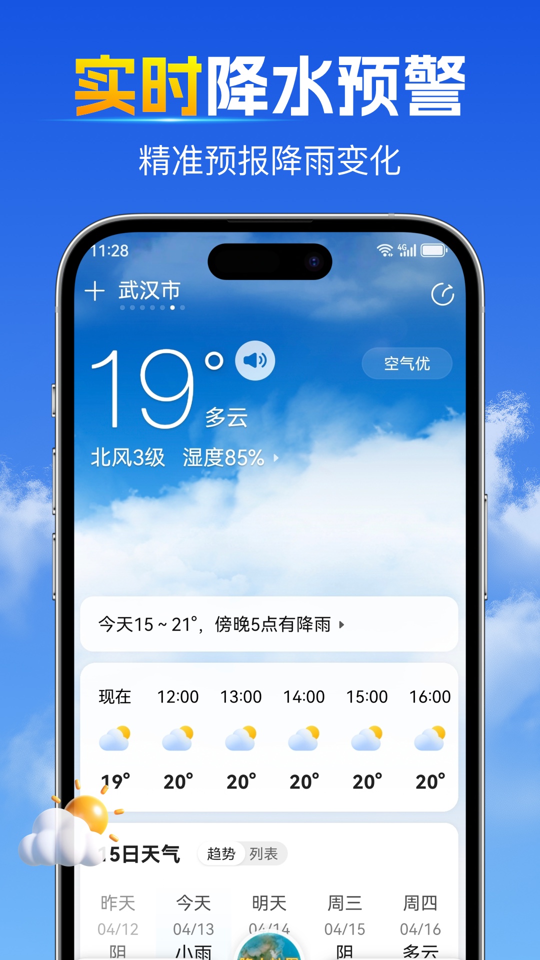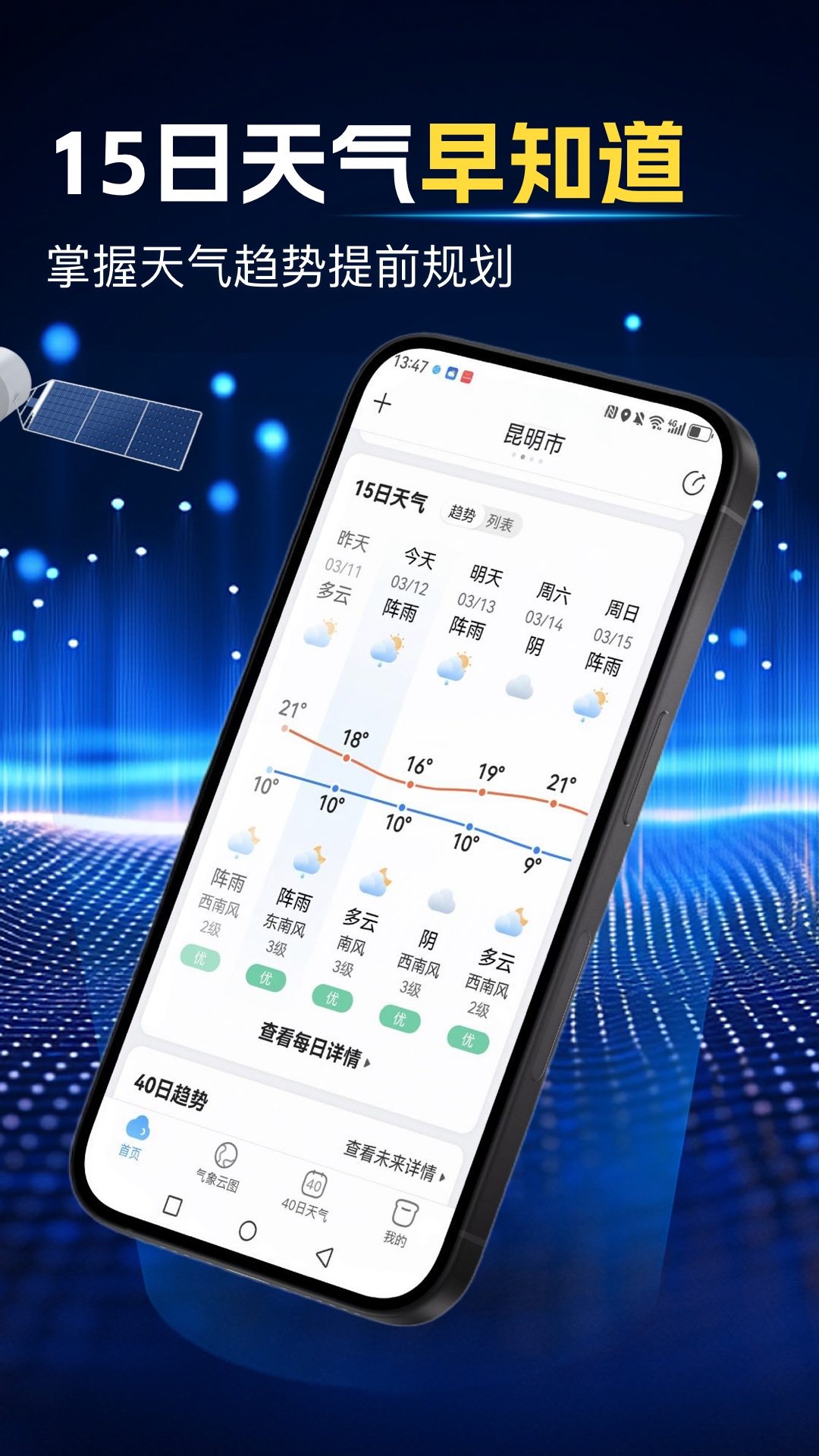 15日天气预报是基于全球权威气象数据打造的超精准天气预报工具,覆盖分钟级短时预警、24小时逐时预报及40天长期趋势,融合健康指南、出行建议重新定义天气服务的温度与科技感!<br><br>核心功能:<br>[分钟级降水雷达 · 告别突发暴雨]<br>0-2小时精准到分钟:实时刷新降水强度与移动方向;精准预报几点几分下雨,及时调整出行计划。<br><br>[台风眼实时追踪 · 防灾避险先知]<br>卫星云图+预测路径:台风强度、距离、影响范围实时更新,叠加历史台风案例参考;更有防御指南,灾害应对有备无患。<br><br>[40日超长预报 · 决策未来日程]<br>跨月度趋势推演:重大活动、旅行、农事提前规划,支持气温/降水日期呈现。<br><br>[智能语音播报 · 解放双手]<br>场景化触发:播报当日天气+穿衣指南及明后两天天气情况。<br><br><br>人群适配:<br>上班族:通勤时段精准降水提醒,告别突发暴雨尴尬<br>农业生产者:暴雨台风早避让,播种采收零延误<br>家庭用户:儿童/老人关爱模式,敏感天气自动推送防护贴士<br>旅行达人:多城市天气一键收藏,异地气候早规划<br>运动爱好者:紫外线/风速/体感温度专业数据,助力科学锻炼