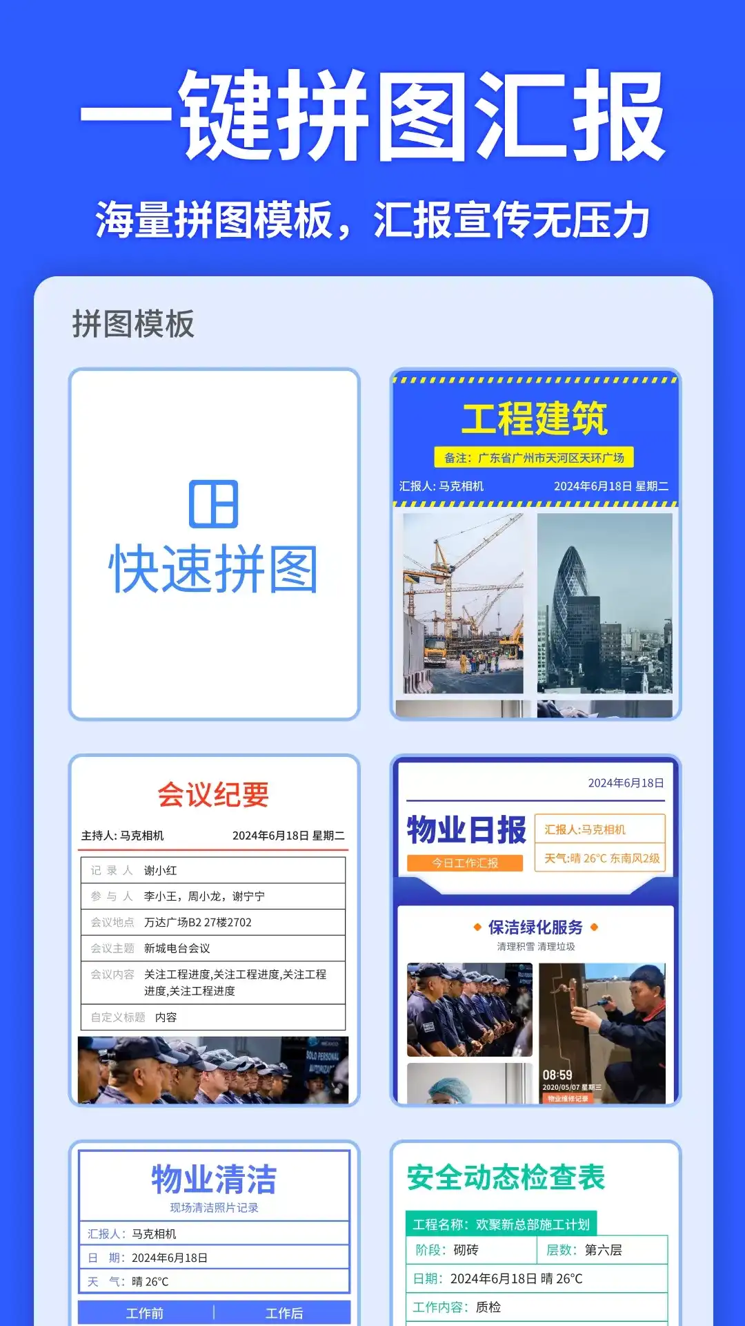 这是一款工程施工拍照管理应用,按照工程及施工地点管理施工照片的水印相机;在照片上添加水印:做施工记号,记录经纬度、海拔、方位角度、地理位置、天气、工程信息及自定义备注等。 主要功能 1.工程及施工地点管理。 2.添加水印:做施工记号、记录经纬度、海拔、方位角度、地理位置、天气、工程信息及自定义备注等;多种不同行业风格的水印可选。 3.照片编辑涂鸦及分享好友,一键导航,一键导出。 4.云盘存储,云端备份工程信息及照片,多设备间同步。 5.团队共享,邀请团队成员加入工程,管理团队成员的施工拍照。 6.云端相册,工程备忘录,拼图汇报。 适用于市政工程、交通工程、电力工程、天网工程、土建工程、园林绿化、市政道路清扫保洁、市政设施施工、装修施工、建筑施工等各种工程的拍照分类归档。