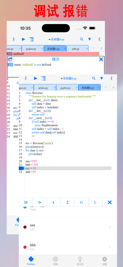 这是一个 Python3.13 高效学习、快捷编程、本地运行、断点调试、精准报错、Git获取、iCloud存取、局域网HTTP FTP 多点连接 高效传输、快乐分享的学习工具。 (^.^)它渴望帮到 想学习、在开发、求进步的您!!!(^.^) *随心PyPI下载纯python库 *随心阅读多彩学习资料,边学习边运行实例,易于理解,高效学习。 *随心使用断点调试、精准报错、代码模板、自动联想、自动缩进、代码颜色、符号补全、符号键盘,文本搜索、多文件搜索、多行缩进,多行注解,让开发更便捷。 *随心 iCloud 存取,多端同步,高效协同。 *随心Git 获取 gitee.com GitHub 上的源码项目。 *随心局域网或蓝牙连接,通过HTTP FTP 多点连接 高效传输文件。 *随心通过内置浏览器查找学习资料,在内置浏览器中选中代码就可运行代码。 *随心通过文件系统支持打开py,txt,pdf,chm,mp3,m4v,zip,gif,png,html,py,doc…文件格式。 *随心调整代码颜色及字体大小,行间距离,让阅读更舒适。 *随心控制背景图片和颜色,文字颜色及阴影,文字字体,文字大小,背景动画,切换界面动画,主界面标签栏的个数及顺序,打造您个性学习软件。 *随心把 Python3.13 脚本与学习资料生成二维码,也可以通过扫描二维码获得脚本与学习资料。 *随心把 Python3.13 脚本与学习资料通过邮件,Weibo,Twitter,Facebook分享。 代码模板——新建文件的内容会复制代码模板的内容。 很多库有C扩展,需要开发者移植,如果您想移植库请联系开发者:QQ:1301367159, 微信:1301367159。 已经移植成功的库如下: Python:3.13.0 cython-3.1.0 OpenCV-4.11.0 scikit_learn-1.7.dev0 Numpy:2.2.0dev Pandas:3.0.0dev scipy:1.15.0dev matplotlib:3.11.0dev seaborn-0.13.2 Scrapy-2.12.0 kiwisolver-1.4.5 lxml-5.3.0 pillow-11.2.0dev requests-2.32.3 statsmodels-0.15.0.dev wrapt-1.17.2 yfinance-0.2.54 skimage-0.26.0 wordcloud-1.9.4 pydantic_core-2.27.2 jiter-0.8.2 astropy-7.0.1 pyerfa-2.0.1.6 bcrypt-4.3.0 tornado-6.5b1 biopython-1.86.dev0 regex-2024.11.6 cffi-1.18.0.dev0 markupsafe-3.1.0 pyemd-1.0.0 cryptography-45.0.0.dev1 pynacl-1.6.0