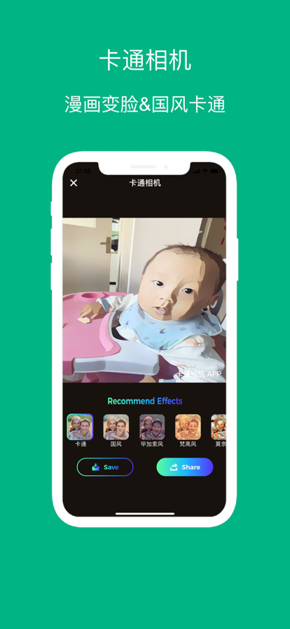 用最美卡通照片App,制作卡通效果图片怎么样? 使用此APP,只需轻轻一键就可以让照片转换成艺术效果。 你会在里面发现什么 -快速制作流程 -时尚的界面设计 -多种样式风格 -制作你的专属漫画照片 只需一张照片,最美卡通照片App就可以轻松创建一个个性化的卡通图片,看起来几乎和真人一样好。一键成为角色创造者!