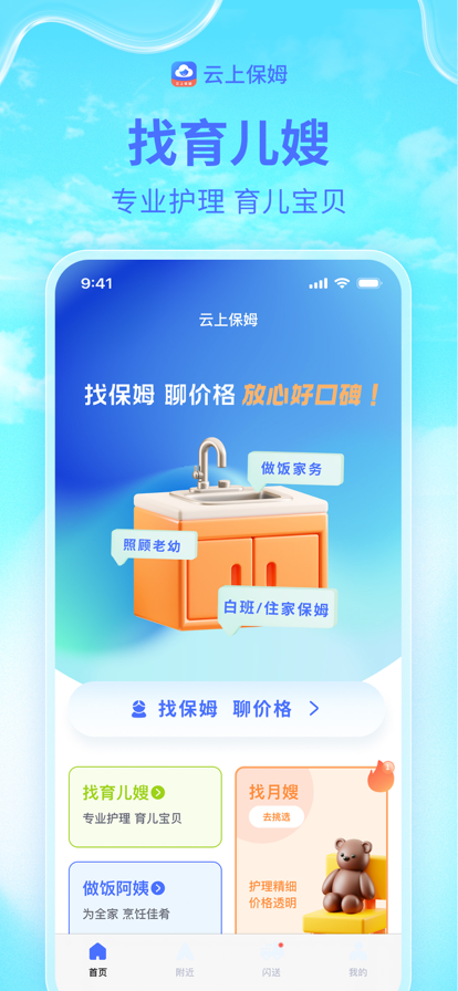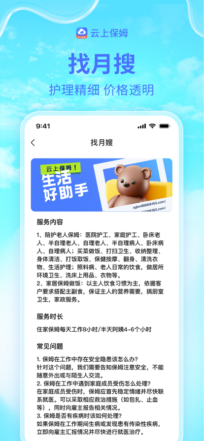 云上保姆手机app提供全国30+城市的育儿嫂、月嫂、做饭阿姨等各类家政服务的查询和预约,专注为国内有需求的家庭提供安心、优质、敏捷的一站式护理服务。 【服务项目】 1,月嫂住家照顾孕产妇、婴幼儿,育儿嫂住家做饭陪伴儿童成长,可面试可面谈 2,别墅家务、钟点工、保洁、家居收纳、新居开荒、空调清洗、甲醛治理等 3,护老服务,陪护、饮食起居照料、健康监测 【服务亮点】 1,可供挑选的数量多,可面试可面谈,选到适合的再安排 2,经过专业的技能培训,持证上岗,可免费调换 3,个性化用心服务,敏捷响应,省心安心 【联系我们】 www.luckybaomu.com yunshangbaomu#yiqiwork.com 找育儿嫂、找月嫂、找住家保姆、找保洁、找钟点工、家居收纳,尽在云上保姆