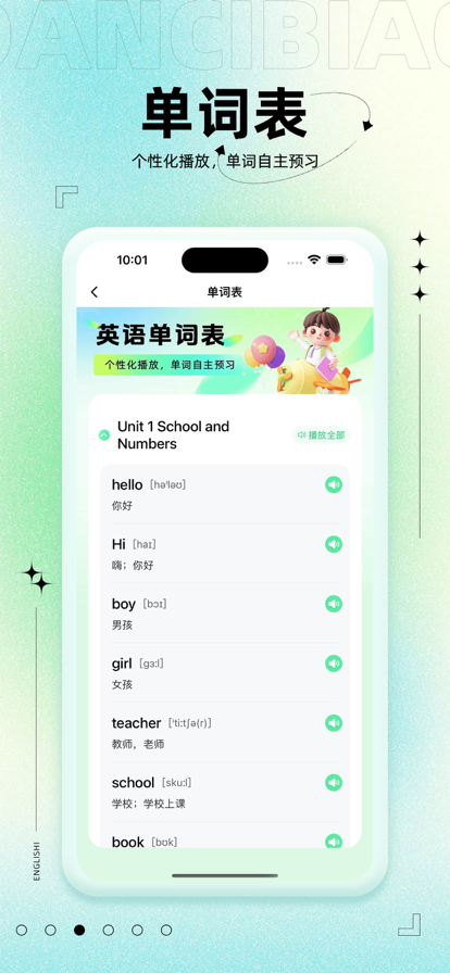 闽教版英语同步学,是每位小学生英语学习的得力助手。我们专注于打造一个高效、互动、有趣的自主学习平台,让孩子们在轻松愉快的氛围中掌握英语知识。 【个性化单词表】 我们的单词表功能不仅提供标准发音,还能根据每个孩子的学习进度和记忆曲线进行个性化调整。单词记忆不再枯燥乏味,而是变成了一场有趣的探索之旅。 【互动式单词跟读】 模仿是学习语言的重要一环。闽教版英语的单词跟读功能,让孩子们能够听到专业发音,并立即模仿,实时反馈发音准确性,确保每一个音节的发音都清晰、标准。 【智能单词听写】 通过智能听写练习,孩子们可以巩固所学单词,提升听力与拼写能力。系统会根据回答情况智能调整难度,确保学习效率最大化。 【生动听课文】 闽教版英语精选课文内容,配以生动的朗读和丰富的情境图片,让孩子们在沉浸式听力练习中,提升理解力和语感,让课文学习变得生动有趣。 我们相信,每个孩子都拥有无限潜能,闽教版英语就是那把钥匙,帮助他们解锁语言学习的大门。现在就下载闽教版英语,让我们一起在英语的世界里遨游吧!