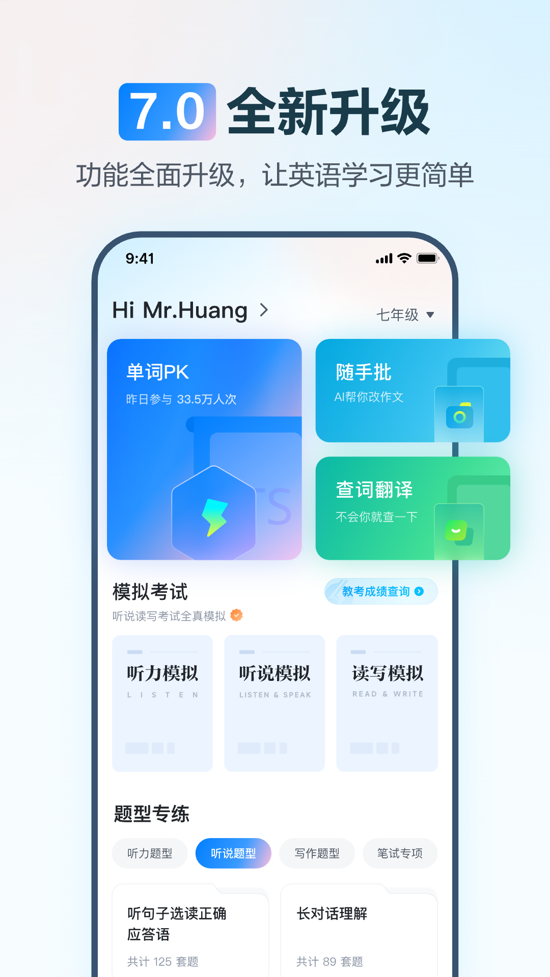 翼课学生,全面满足小、初、高学生英语趣味化自学及英语科目同步训练&测评需求。即刻下载,开启你的奇妙成长之旅吧~ <br>*单词训练* <br>单词强化训练,体验极具趣味化的学习方式。学英语竟然可以这么有趣! <br>*PK竞技场* <br>英语口语谁更棒?何须考场见分晓,大侠or大虾,竞技场上我们一较高下! <br>*趣味配音* <br>最火大片你来做主角,小手一抖评分即刻分享。在这里,你就是电影配音家! <br>*同步训练* <br>同步翼课教师训练、测试系统,答题无需纸笔,手机就能轻松搞定! <br>*智能备考* <br>针对个人知识点掌握情况,系统智能个性推荐,专属于你的中高考备考提分利器!