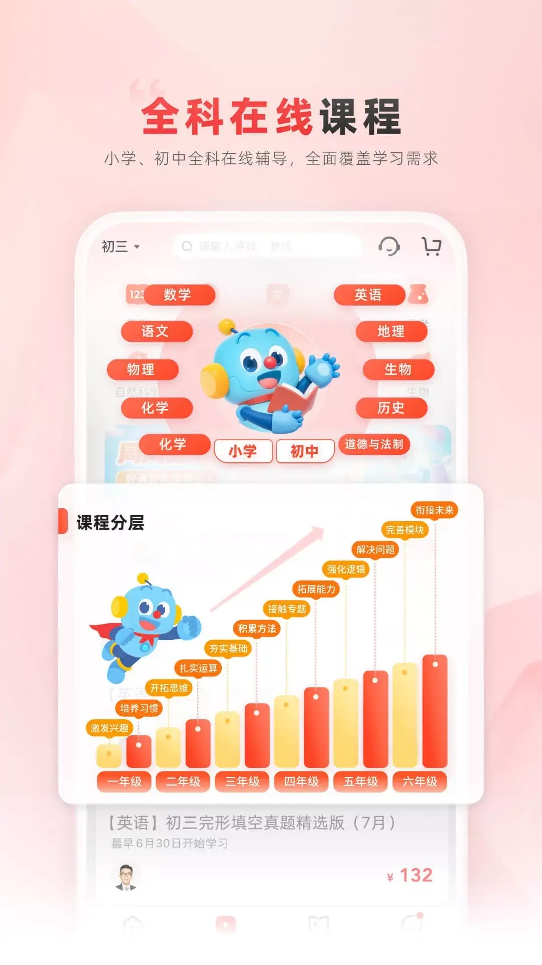途途课堂致力于为6-18岁孩子提供小学一年级至高中三年级全部学科的课程及服务。 途途课堂采用“授课+辅导”的在线直播双师模式,主讲老师直播授课,讲解核心知识点,二讲老师辅导伴学,为孩子答疑解惑。 途途课堂通过大数据、人工智能与在线教育相结合,围绕“大班主讲,小班二讲,个性体验”,持续研发和迭代在线直播课程产品,为中小学生提高学习效率以及教育普惠持续努力。
