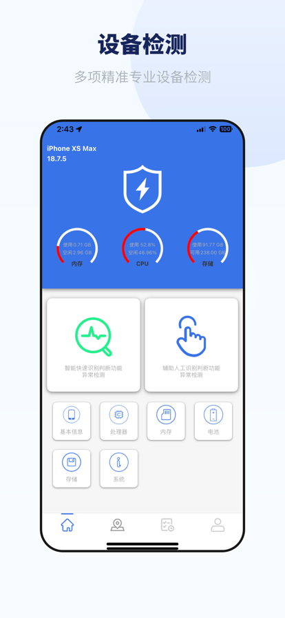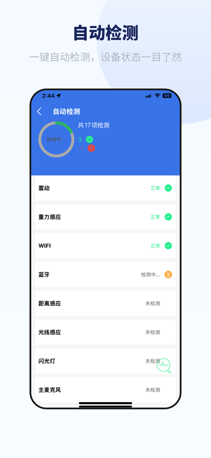 检测豹是一款专业的手机设备检测软件,可自动检测iOS设备的内存、系统版本等基础信息;可自动检测手机等Wi-Fi、蓝牙、感应器、音频、摄像头、按键、触摸等共二十多项手机功能,方便快捷准确。