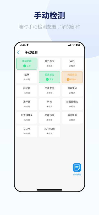 手机检测助手,是一款专业的功能检测工具! 【1.全方面检测项目】 可检测指南针,振动,重力感应,WiFi,蓝牙,距离感应,光线感应,闪光灯,触摸功能,麦克风,扬声器,听筒,网络锁,按键功能,3D Touc功能,摄像头,屏幕显示,指纹面容,充电功能,通话功能等。 【2.可选检测方式】 自动检测,自动识别检测结果数据,智能判断检测项功能正常异常。 手动检测,提供展示检测数据变化值,辅助人工准确判断检测结果。 【3.共享检测结果数据】 生成检测结果二维码,可扫码获得检测结果的json数据,共享检测,你我共赢。 问题反馈,商务合作,加盟合作,推广合作,请联系QQ379802456