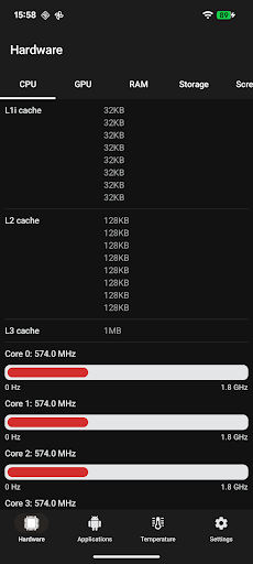 CPU信息提供有关设备硬件和软件的主要信息:<br>- CPU 规格(特定内核上的当前频率) <br>- GPU规格<br>- RAM和存储状态(内部、外部和SD卡)<br>- 显示指标 <br>- Android 操作系统详细信息<br>- 传感器数据 <br>- 电池状态<br>- WiFi 和蓝牙 MAC 地址(在旧版 Android 上)<br>- 声卡信息 <br>- 其他应用程序中使用的本机库<br>- CPU和电池温度监控器 <br><br>此外,您还可以管理已安装的应用程序并检查正在运行的进程(在旧版 Android 上)。 <br><br>信息:整个项目现在将开源:https://github.com/kamgurgul/cpu-info <br>所有问题和想法都可以发布在 Github 上。<br><br>此外,该应用程序支持Wear OS,允许您显示手表数据并管理应用程序。