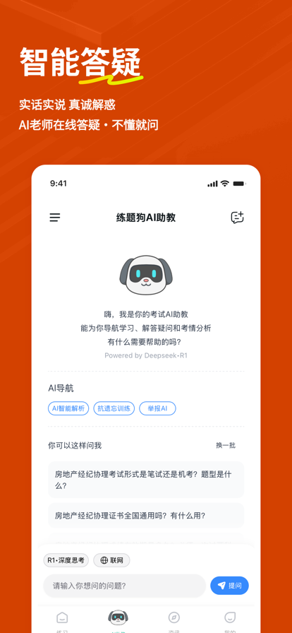 海量题库+AI助教+精准解析,三位一体备战房地产经纪人协理考试~ AI助学焕新上线,章节刷题结合房地产经纪人协理考试大纲,AI智能推题精准定位薄弱环节,结合艾宾浩斯遗忘曲线研发"21天抗遗忘训练",让知识点过目不忘! 房地产经纪协理练题狗备考题库是考生专用的实现科目练习和模拟考试的手机端APP软件,集智能辅导、详细解析、AI解析、全真题库和考试考情于一身,涵盖了章节练习,历年真题,预测试卷,每个科目独立题库,刷题简单,节省复习时间,含有答题解析、错题巩固、统计分析、模拟考试等多功能模块,在复习过程中查漏补缺,提高您的综合分析能力、拓宽知识面。备考王牌APP!愉快的房地产经纪人协理考试备考刷题体验题库在手,备考无忧! >>练习: 【章节练习】题库内所有科目的章节练习均可免费使用。 【历年真题】收录近几年房地产经纪人协理考试真题,与考试亲密接触。 【高频题目】大数据分析房地产经纪人协理考试高频题目,备考重点难点一网打尽。 【错题巩固】独特错题巩固功能,清除您备考路上的顽固障碍。 【AI解析拓展】每个题目新增AI解析拓展,帮助您全面了解知识点。 【AI智能推题】个性化推送薄弱知识点+顽固错题+抗遗忘特训题。 【学习资讯】备考资讯,官方通知,复习技巧尽在房地产经纪协理练题狗。 【技术支持】鼎维云课堂 【联系我们】 微博:@练题狗 微信:liantigouapp 客服电话:+8618290463382 (工作日9:00-18:00)