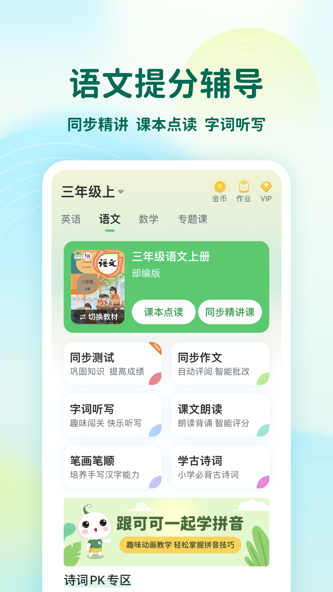 可可宝贝-中小学语文数学和英语学科智能提分辅导,让孩子提分更高效,同步教材覆盖全国各地小学,五星好评如潮。 『英语学科』 1、同步讲解:教材同步趣味动画教学视频,重点讲解知识点,精选试题查漏补缺。 2、课本点读:同步教材、纯正发音、贴心翻译,可点读、连读、复读、实时智能评分。 3、趣味配音:精选电影、动漫片段,孩子可以玩配音当主演,有效记单词和练口语。 4、单词背诵:课文同步单词,单词闯关PK,跟读、测试和听写全面练习,记忆更有效。 5、口语训练:课文同步对话,角色扮演、智能评分、矫正发音,让你忍不住开口说英语。 6、双语绘本:精选经典中英双语绘本、孩子可以朗读配音,创作自己的绘本。 【语文学科】 1、同步讲解:教材同步趣味动画教学视频,精选试题查漏补缺。 2、课本点读:同步部编版语文教材、纯正发音、智能评分。 3、字词听写:1~6年级课文字词同步,趣味闯关,快乐听写。 4、作文批改:语文手写作文拍照上传,实时智能纠错和评分。 【数学学科】 1、同步讲解:教材同步趣味动画教学视频,重点讲解知识点。 2、口算闯关:教材同步口算练习,支持竖式,支持主流版本的教材。